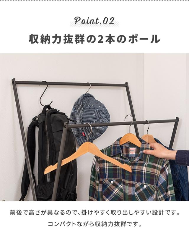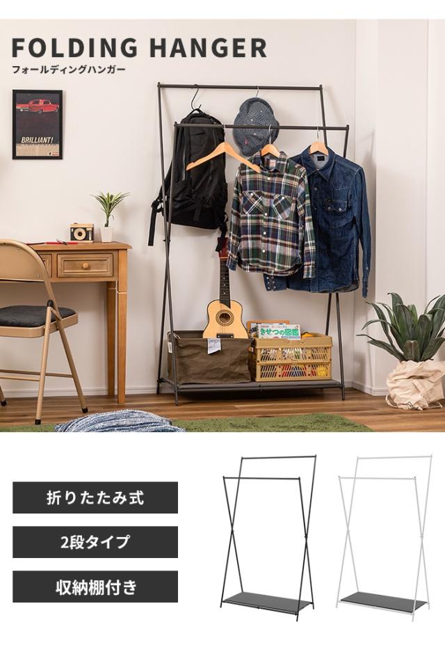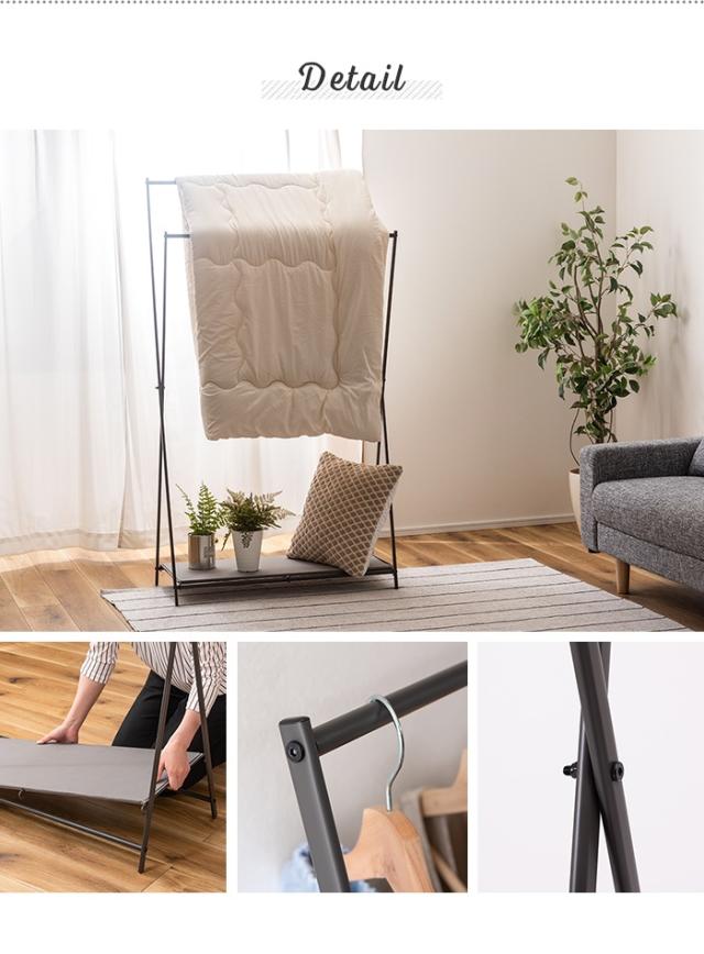 | コンパクトで軽く、どこにでも持ち運べる大容量のフォールディングハンガー。 ショップのディスプレイのようにお気に入りの洋服や小物を飾って収納ができます。 2本のポールで抜群の収納力。 前後で高さが異なるので、掛けやすく取り出しやすいデザイン。 下段は箱や小物が置けるラック付き。 使わない時は折りたたんで隙間に収納可能。 脚の先端には保護パーツが付いているので、床への傷防止にもなり安心。 |