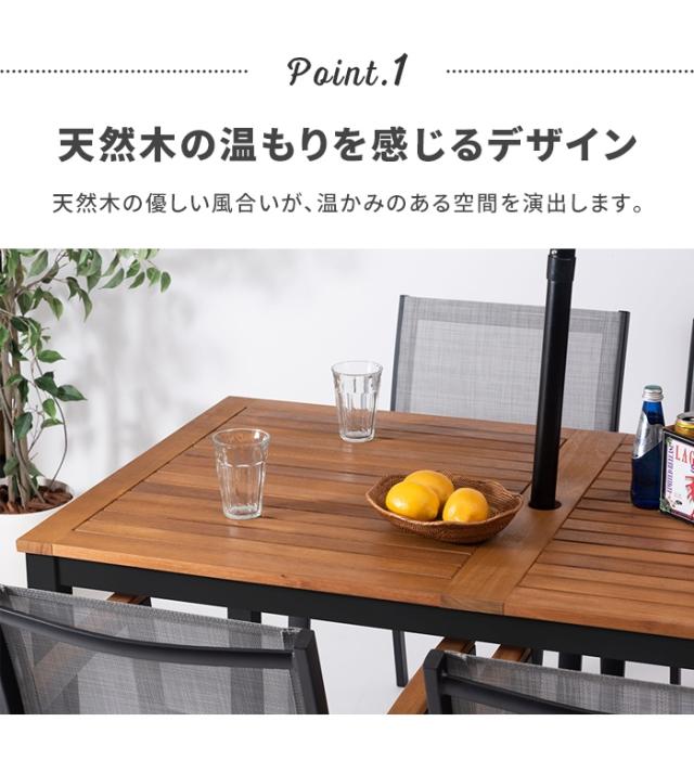 キーワード: オリー ダイニングテーブル 天然木 ユーカリ 木製 木目 ガーデン ガーデンテーブル 庭 屋外 テラスベランダ アルミ パラソルホール アジャスター かわいい おしゃれ ブラック 黒 グレー 灰 幅140 奥行80 高さ74 四角 長方形 角型 4人