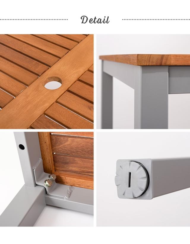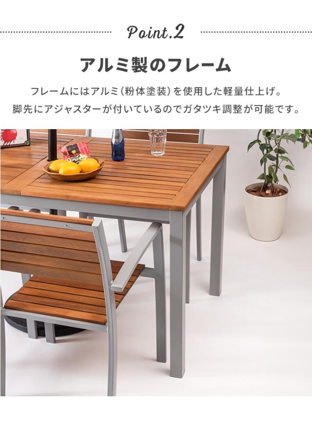 | 天然木の風合いと軽量なアルミの組み合わせ。 シャープなラインでシンプルにまとめたフォルムに天然木の表情を加え、スタイリッシュな中にあたたかみのあるシリーズ。 脚先にはアジャスターが付いているので、ガタツキ調整が可能。 天板中央にはガーデンパラソル用のパラソルホール付き。 |