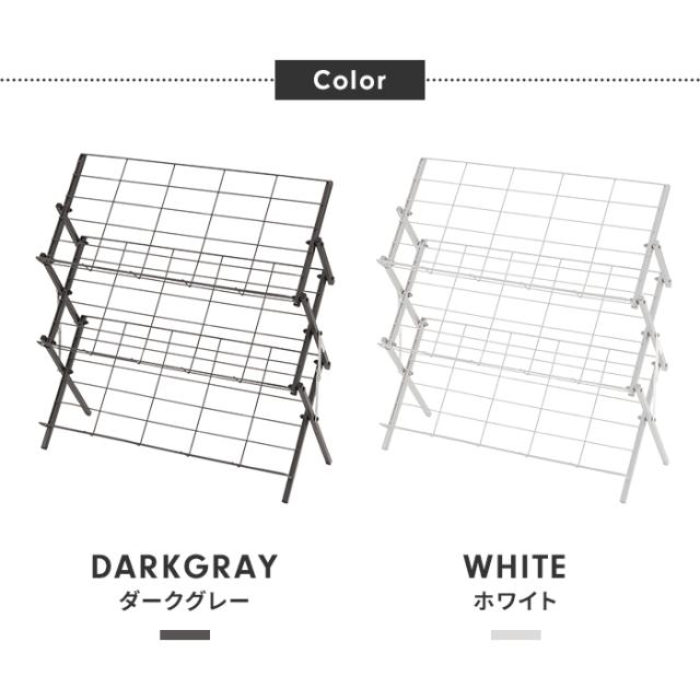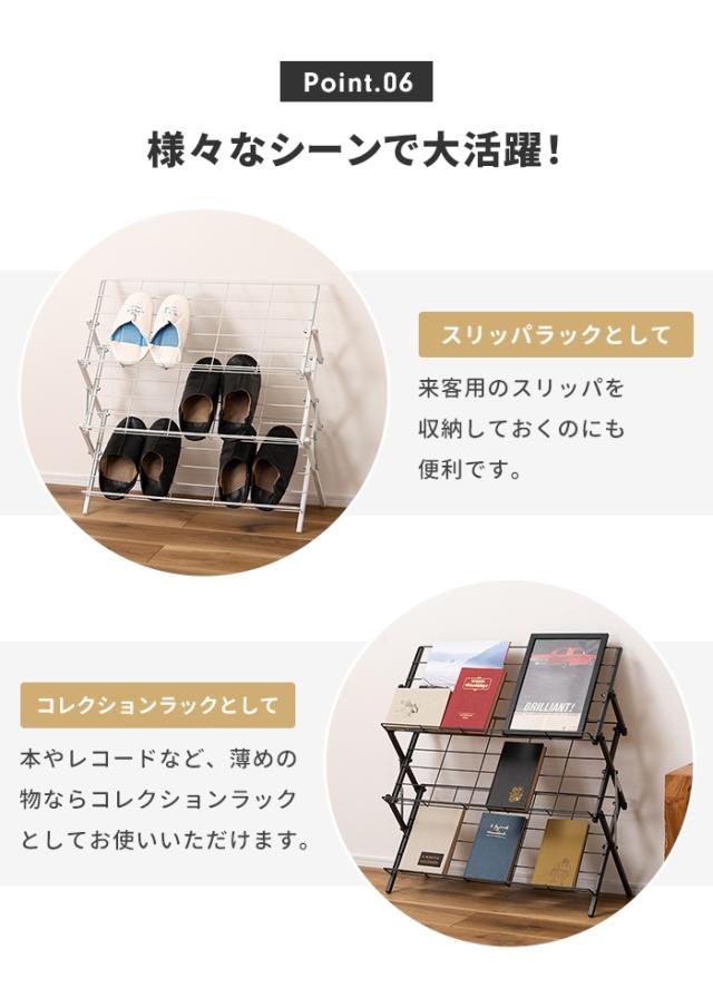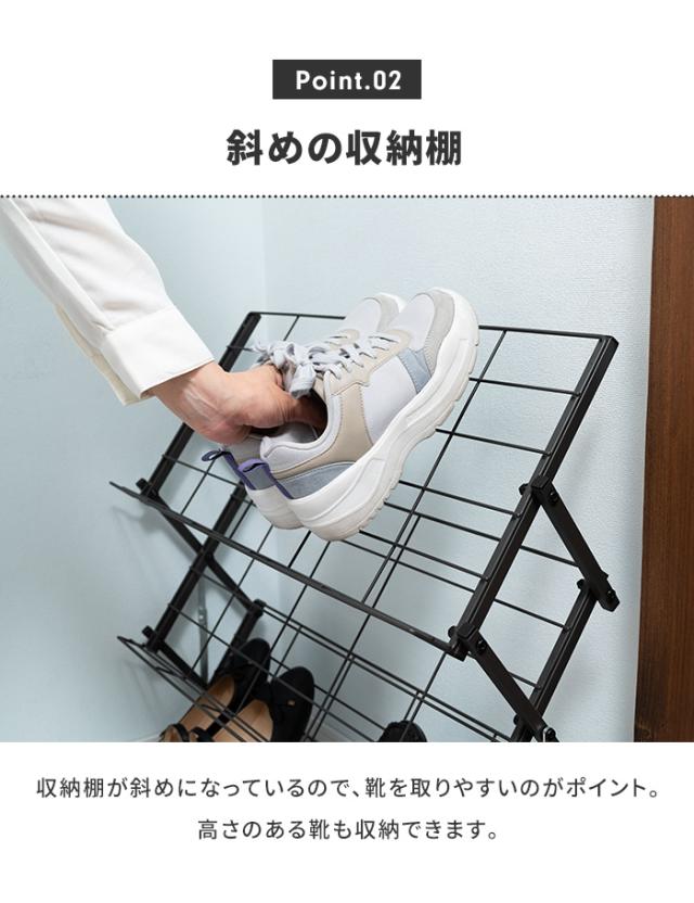 | 折りたたみ可能で、省スペースなシューズラック。 スチール素材で通気性も良く、見た目もサイズもスッキリとしたデザインのシューズラック。 更に、折りたたみが可能なので、使わない時は場所を取らずに収納しておけます。 斜めの収納棚で、取りやすい設計。 かかと部分のストッパーで靴が滑りにくい。 折りたたみ可能で省スペース収納。 スリッパラックとして。 コレクションラックとして。 フックが掛けられるので靴べらや折りたたみ傘の収納も |