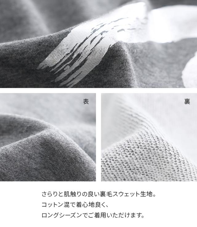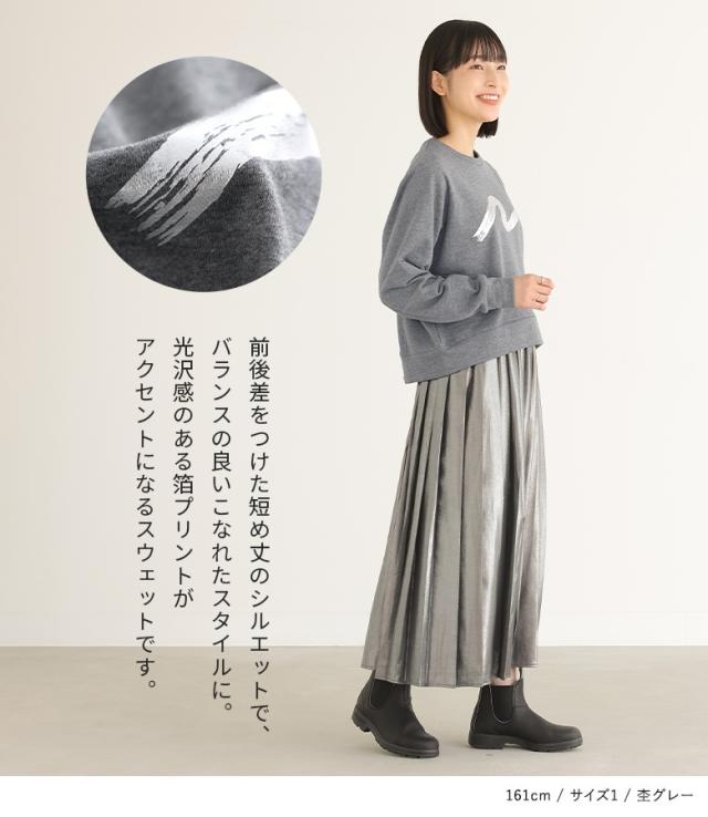 【SALE】『箔プリント裏毛スウェット』【メール便不可】【20】[スウェット 長袖 レディース トップス トレーナー 裏毛 カットソー 箔 プリント ショート丈 クルーネック 綿混 ロングシーズン]
