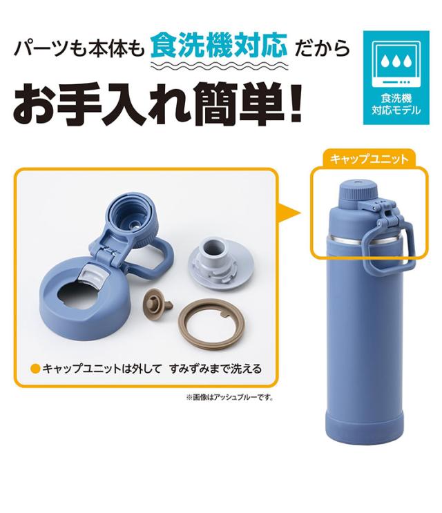 内びん:ステンレス鋼 / 胴部:ステンレス鋼(アクリル樹脂塗装)/ フタ・ループ・キャップ本体・飲み口:ポリプロピレン / フタパッキン・シールパッキン・ボディリング・ソコカバー:シリコーンゴム