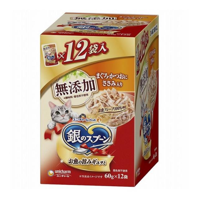 【4個セット】 ユニチャーム 銀のスプーンパウチ 無添加まぐろ・かつおにささみ入り 60g×12袋【送料無料】