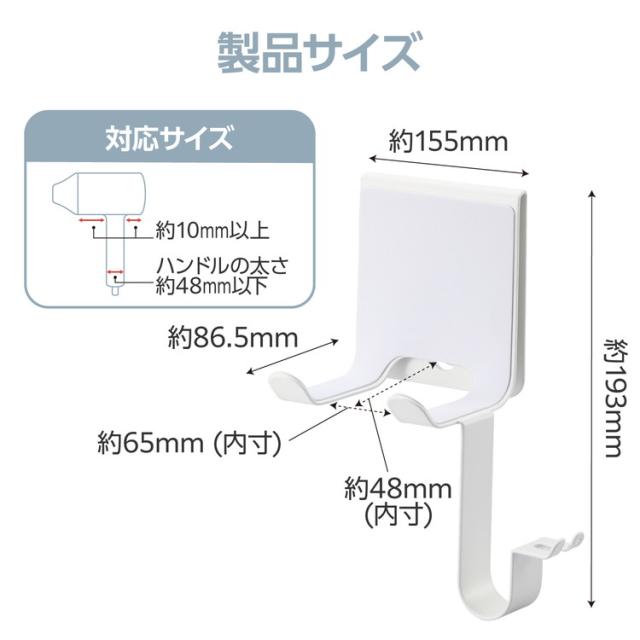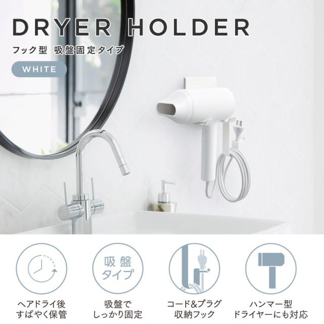 ドライヤーの出し入れがしやすくなって、洗面スペースもスッキリ!2個の吸盤でしっかりドライヤーを支え、洗面所の壁面や鏡に装着できるドライヤーホルダーです。折りたたみタイプ・ハンマー型のどちらにも使えます。プラグを固定できるフック付きで、まとめたコードが解けずきれいに収納できます。
