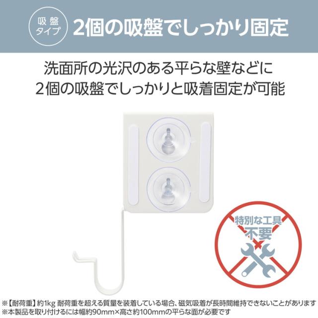 ■※本製品は吸盤固定用です。石こうボード・漆喰・モルタルなどのもろい壁・コンクリート・ブロックレンガなどの堅い壁・設置面が規定対象外となる小さなタイルまたはタイルの目地・布地・合成を含む皮革・目の粗いシボ面・曲面・塗装面・凹凸や斜めなどの特殊な形状の面・段差のある面・たわむほど柔らかな面・窓ガラス・不安定な場所には取り付けることができません。