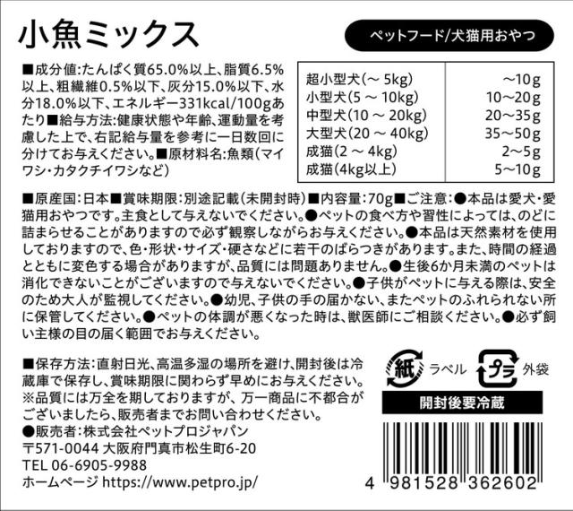 【4個セット】 ペットプロ 国産おやつ 無添加 小魚ミックス 70g 国産 日本製 犬用 犬 猫用 猫 おやつ スナック
