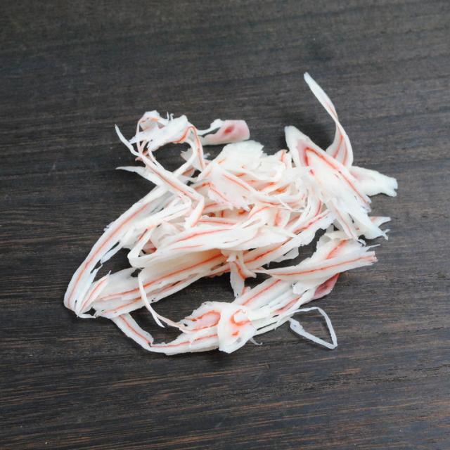 たらすり身、でん粉類、かに肉、食塩、植物油脂、ソルビトール、調味料(アミノ酸等)、着色料(コチニール、アナトー)