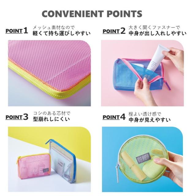 ポップなカラーとシアー感が特徴の軽やかなメッシュポーチです。