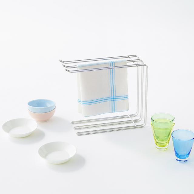 「キッチンハンガー シルバー」は、ふきん、ワイングラス、ペットボトル、まな板などの小物を置けるスリムボディの便利なキッチンハンガーです。横向きに置くと、「ふきん」や「ワイングラス」をかけて使えます。ふきんは一度に3枚まで乾かせます。縦向きに置くと「ペットボトル」や「ゴム手袋」をかけられるほか、まな板をハンガーの脚の間に渡して、すき間をあけて乾かせます。まな板は2枚まで置くことが可能です。そのほかにも、アイデア次第でさまざまなアイテムを乾かすことができます。18-8ステンレス製なのでサビに強く、簡単なお手入れで長くキレイに使えます。
