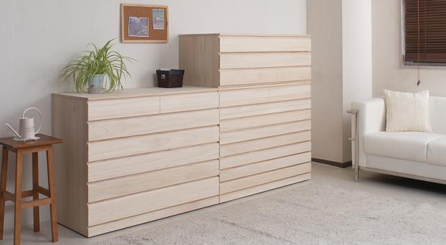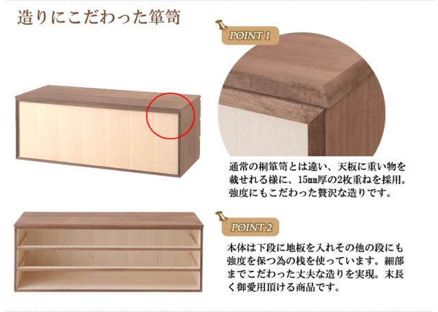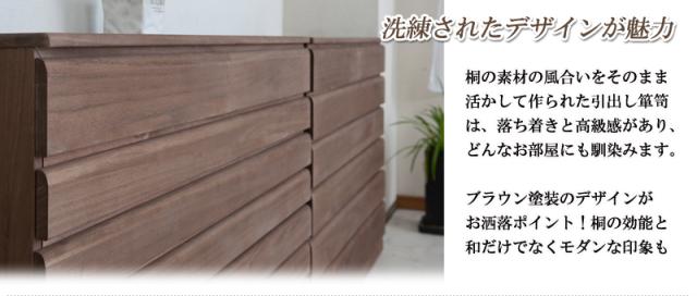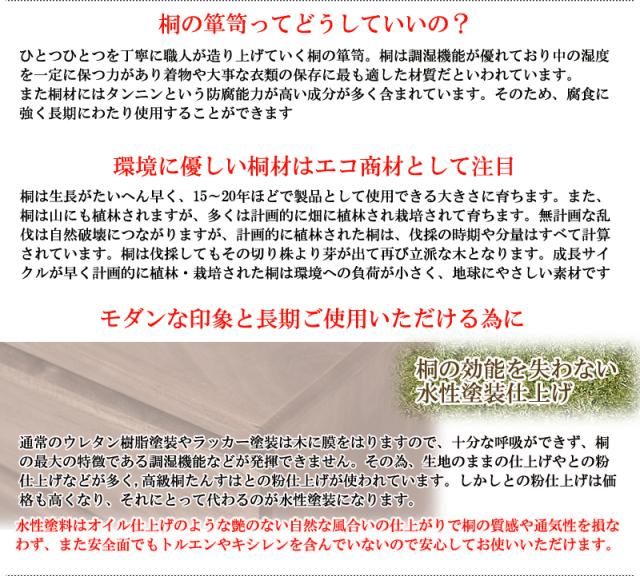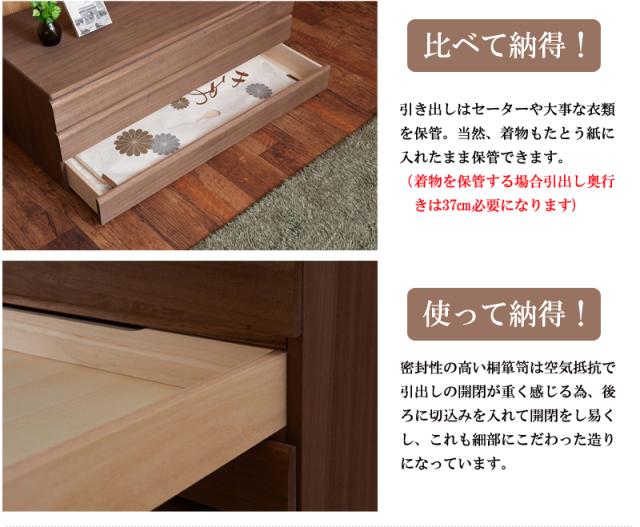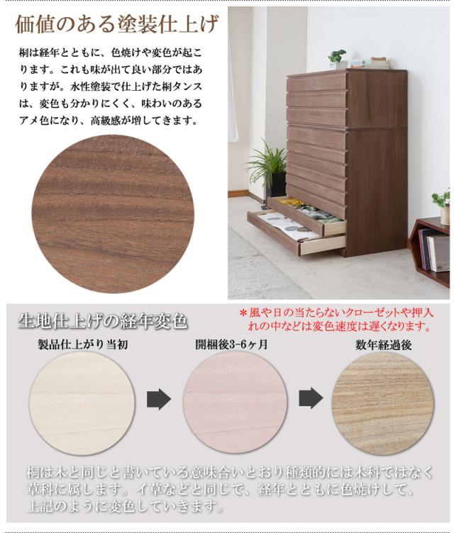 ■商品について/桐の素材の風合いをそのまま活かして作られた引出し箪笥は、落ち着きと高級感があり、どんなお部屋にも馴染みます。マットな艶のない落ち着きのある水性塗装のデザインがお洒落ポイント!桐の効能と和だけでなくモダンな印象も兼ね備えた桐の箪笥です。通常の桐箪笥とは違い、天板に重い物を載せられる様に、15mm厚の2枚重ねを採用。強度にもこだわった贅沢な造りです。本体は各段に桟を入れ、強度を保つようにしています。細部までこだわった丈夫な造りを実現。末長く御愛用頂ける商品です。