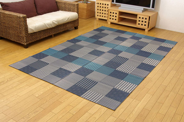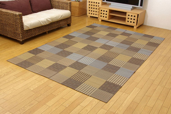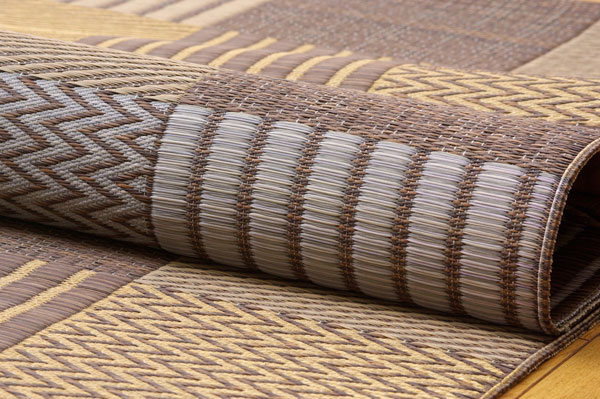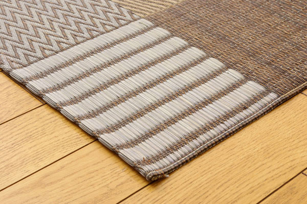 いろいろな織りを組み合わせたパッチワーク風のい草カーペットです。織り方によって違う複数の肌感触をお楽しみ頂けます。落ち着いた色目でモダンな雰囲気に仕上げました。国産(九州産)のい草を使用しています。一本一本が太く、表皮が厚く繊維がキメ細かいので弾力性があり、耐久性に優れています。い草には空気の自然浄化作用、湿度の調節作用などがあります。また汚れにくく、使用するうちに黄金色に変化し味が出ます。い草に青森ヒバ加工を施しています。(抗菌、防臭効果)