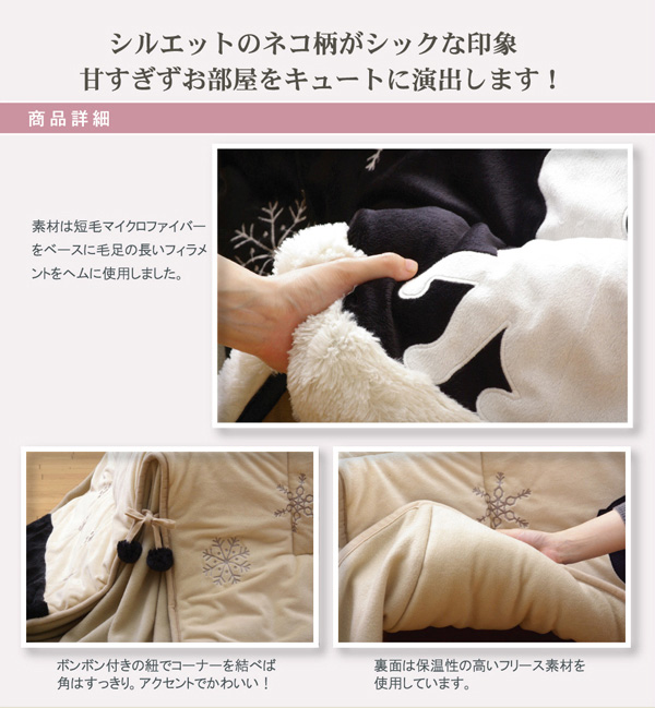 人気のネコ柄のコタツ布団です。ネコの柄をシルエット調にし、雪の結晶はプリントではなく、刺繍で表現することで、甘くなりすぎず、シックな雰囲気に仕上げました。表地には耐久性に優れ、しっとりとやわらかな短毛のマイクロファイバー生地を使用しています。裏地には軽くて保温性の高いフリースを使用しています。省スペースタイプで角が膨らまず、お部屋を広く使えます。薄手なので折りたたんでもかさばらず、コンパクトに収納できます。部分暖房のコタツは電気代もおトクです。