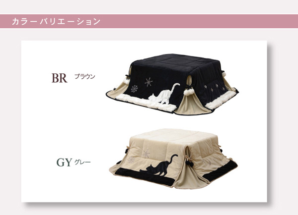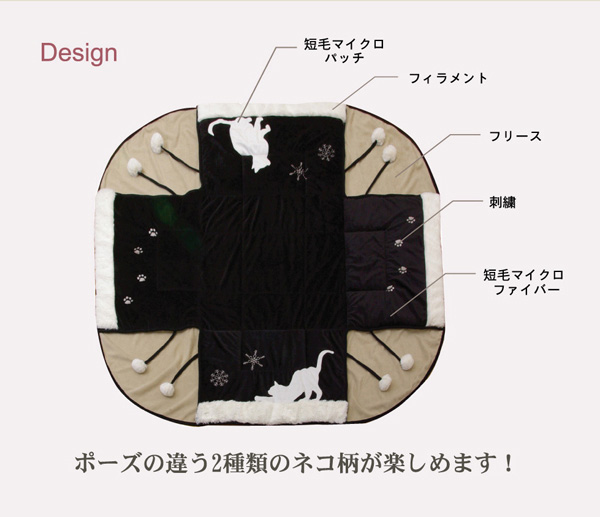 | ■人気のネコ柄のコタツ布団です。ネコの柄をシルエット調にし、雪の結晶はプリントではなく、刺繍で表現することで、甘くなりすぎず、シックな雰囲気に仕上げました。表地には耐久性に優れ、しっとりとやわらかな短毛のマイクロファイバー生地を使用しています。裏地には軽くて保温性の高いフリースを使用しています。省スペースタイプで角が膨らまず、お部屋を広く使えます。薄手なので折りたたんでもかさばらず、コンパクトに収納できます。部分暖房のコタツは電気代もおトクです。 ※写真は表記サイズと異なる場合がございます。 | |