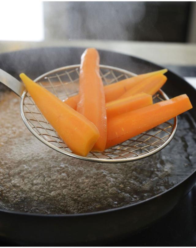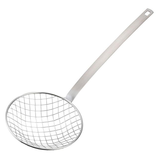 網のカーブは揚げ物等がすくいやすいように設計されています。網は交差部分が固定されている溶接金網なので、汚れがたまりにくく、清潔です。ハンドルは、手の動きに沿った絶妙なカーブになっており、すくいやすさのもう一つの理由です