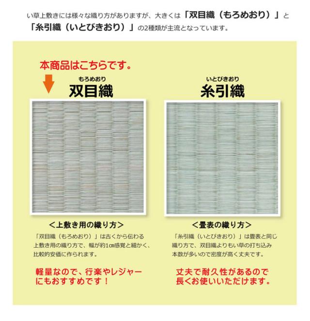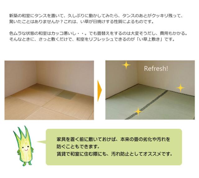上敷きを敷くだけで畳のお部屋をリフレッシュ出来ます。日焼けしてしまった畳のリフレッシュに、新品の畳を汚さないためのカバーにご使用下さい。長さ110〜115cmの国産(九州産)い草を使用しています。そのうち約95cmを使用しています。ヘリ際はある程度白みを帯びます。(日焼けではありません、い草の根元と先端部分の色です。)い草は先端部分が赤茶色く、根元が白く真中が青(緑)色です。真中の良質な青の部分を多く使用するほど、丈夫で綺麗な仕上がりとなります。またイ草は使用するうちに日焼けをしますが、真中の青の部分を多く使用した物ほど全体が綺麗に日焼けし、味が出ます。国産(九州産)のい草を使用しています。