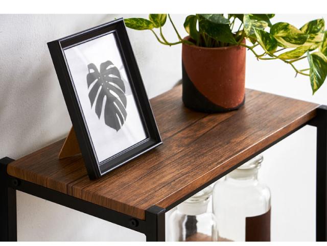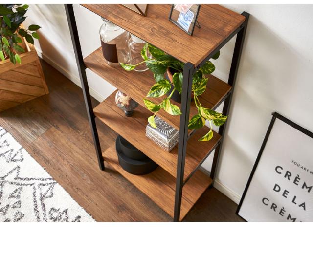 黒いフレームとヴィンテージ調棚板が印象的なブルックリン調の4段シェルフ。