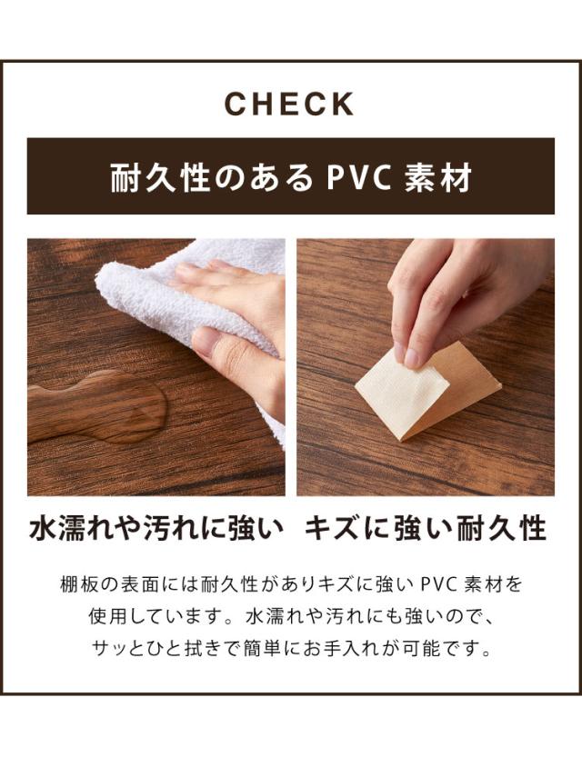 棚板は水に強く傷に強いPVCシートを採用。立体感のある素材でリアルな木目を再現しました。