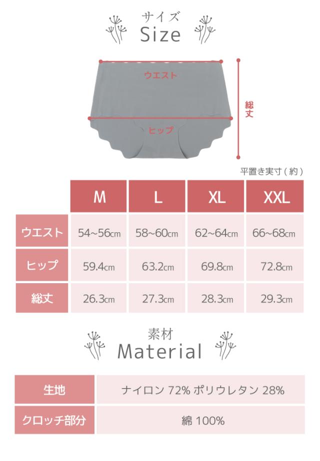 シームレスショーツのハイウエストタイプが登場!通常より約6cm総丈が長く、お腹がすっぽり隠れます。蒸れない素材で通気性◎。無縫製で締め付けフリーのやさしい履き心地。アウターに響きにくいデザインでスタイリッシュに履ける。スカラップデザイン&ベーシックなカラー展開でデイリー使いにgood。M〜XXLまでと嬉しいサイズ展開です。お好きな色だけご購入できる単品売りもございます。ぜひチェックしてみてください。