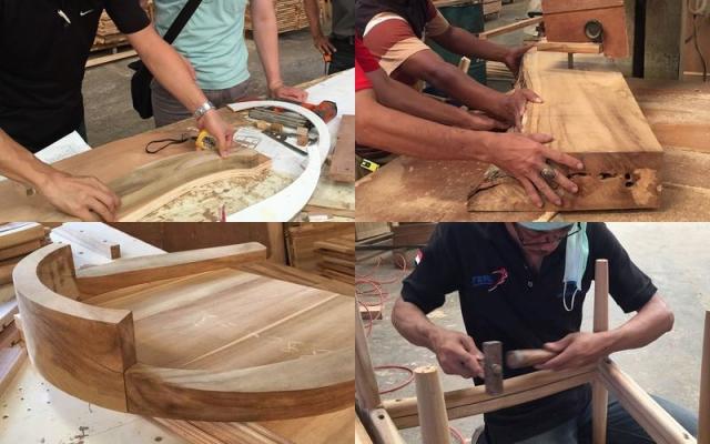 インドネシアの工場で、大きな良質のチーク材から滑らかなラインを一つ一つ削り出しています。