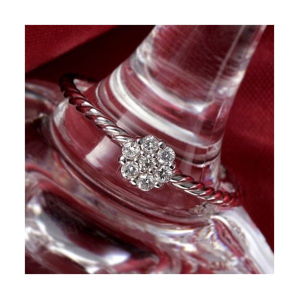 中央のダイヤモンドを取り囲むのは6粒のダイヤモンド!ムギュギュッっとダイヤが密集したように輝くセッティングで、ひと粒の大きなダイヤモンドのような輝きを放ちます