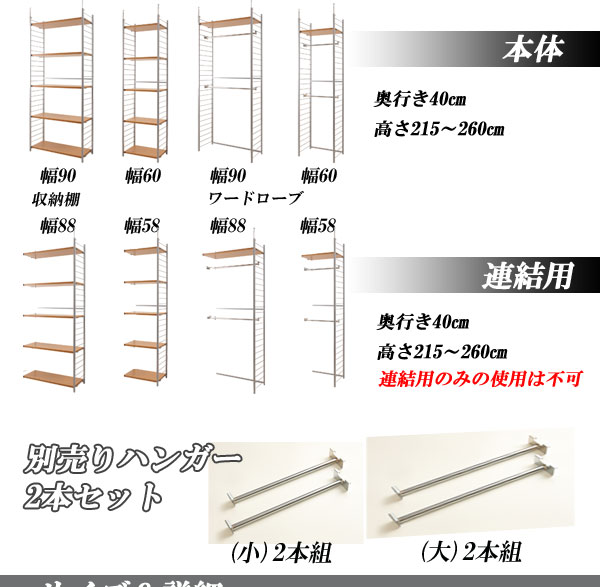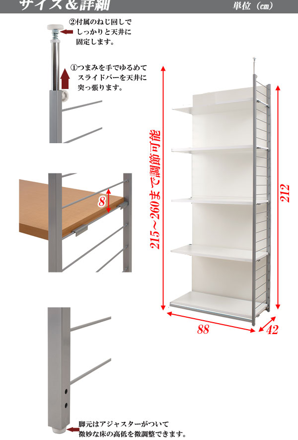■商品サイズ/本体:(約)幅88×奥行42×高さ215〜260cm、収納部内寸:(約)幅85×奥行34.5×高さ8cm間隔で25段階