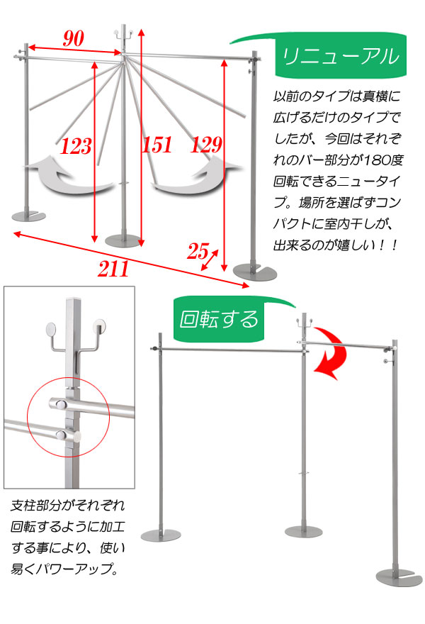 ■商品サイズ/本体:(約)幅25×奥行25×高さ151cm、物干し時:(約)幅211×奥行25×高さ151cm、ポール下:(約)幅90×高さ123cm、(約)幅90×高さ129cm