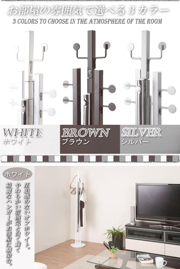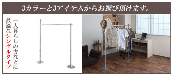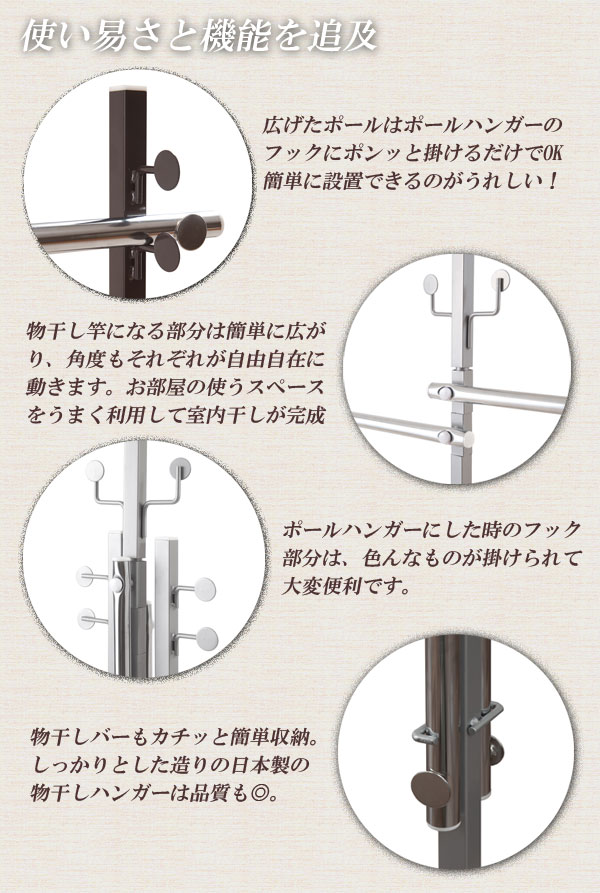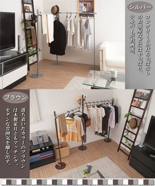 色々な使い方が出来ます!反対側のポールに移動させるだけで、簡単にポールハンガーから、物干し竿に変えることができます!シングルとダブル、可変式の3タイプ、ホワイト・ブラウン・シルバーの3色からお選びいただけます。