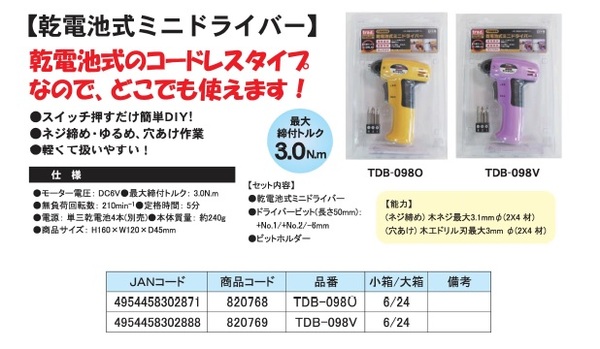 ●スイッチを押すだけ簡単DIY!●ネシ締め、ゆるめ、穴あけ作業●軽くて使いやすい!●能力:(ネジ締め)木ネジ最大3.1mm(2X4材) (穴あけ)木工ドリル刃最大3mm(2X4材) ●セット内容: 乾電池式ミニドライバー ドライバービット(長さ50mm) +1/+2/-6mm ●ビットホルダー