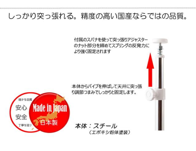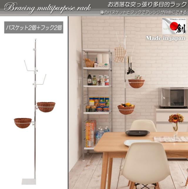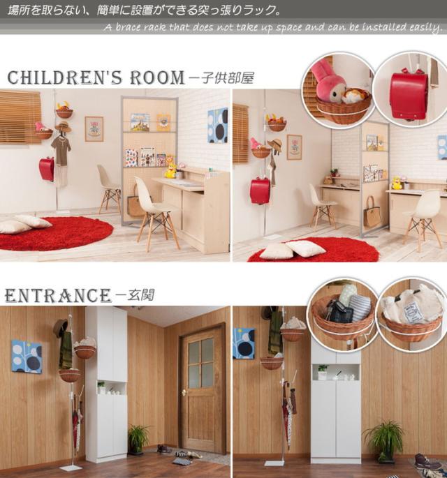 日本製 ラタンカゴ付き ラタン3つ 突っ張り ラック ハンガー付き ハンガーラック 国産 小物入れ(代引不可)【送料無料】