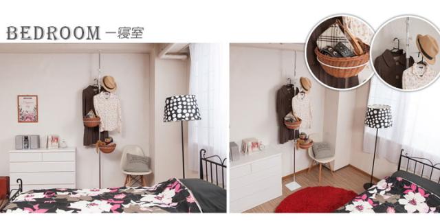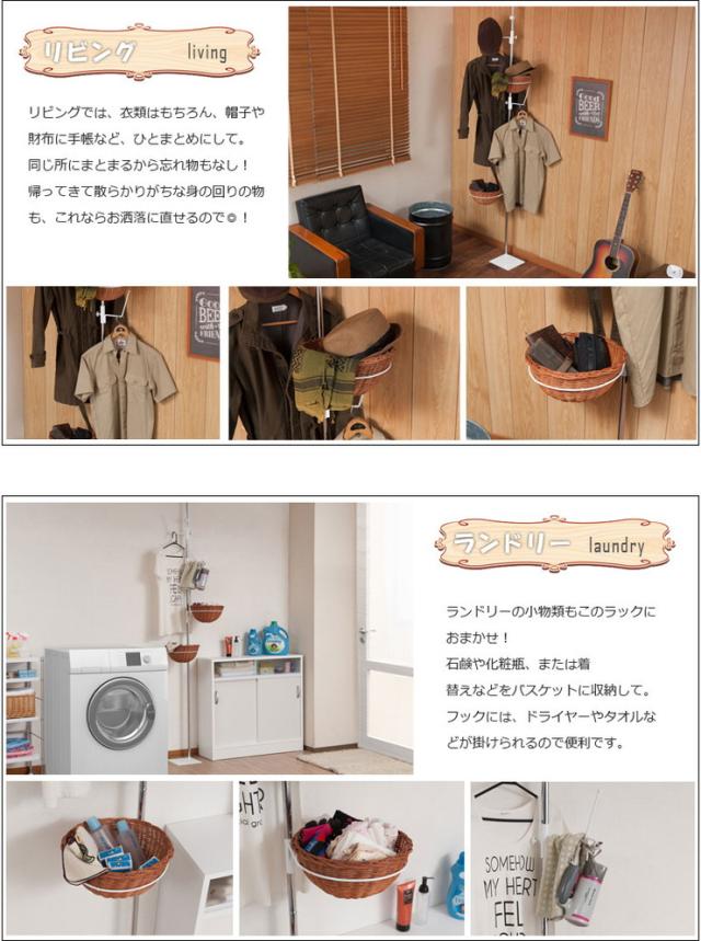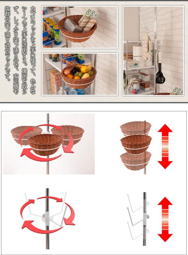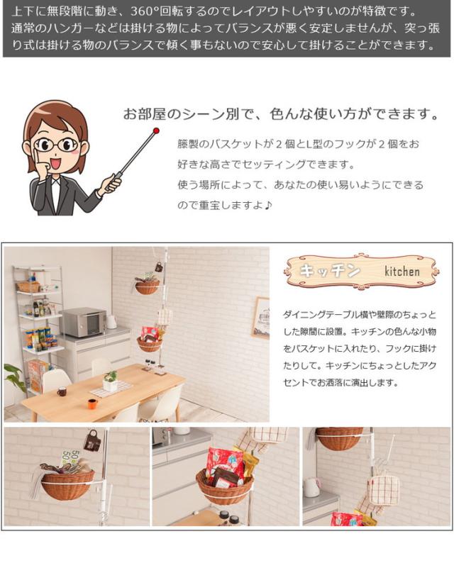 ■商品について/ラタンがお洒落な突っ張り式タワー型収納ラック。ポールに丸いラタンバスケットが2つ、フックが2つ付いて、それぞれ高さ調整はもちろん360度向きも変えられる自由自在の収納ラック。キッチンや玄関など使い方は無限大。白にラタンの配色が可愛く、ラタンを持ち運びできるのも嬉しいポイント。