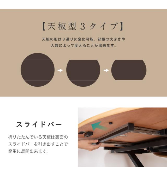 折りたたみ式の面長の天板は、サイドを開くことで簡単に2人用から5人用サイズへと調節が可能なため、活用の幅が広がります。