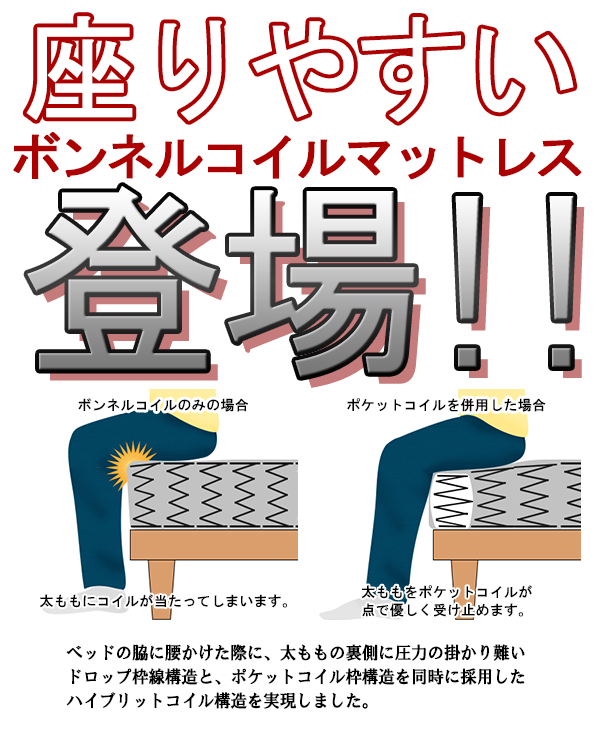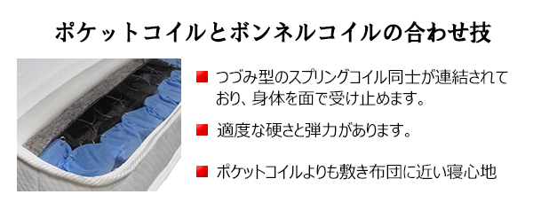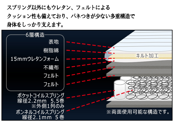 ■マットレス主材:2.1mmボンネルコイルスプリング(コイル数 S:270個、SD:330個、D:390個)、2.2mmポケットコイルスプリング(コイル数 S:92個、SD:98個、D:104個)、表地:ポリエステル 両面多針キルティング加工、中材:ウレタン/フェルト