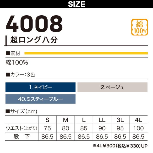 村上被服 HOOH 鳳凰 4008 秋冬 綿100%超ロング八分 鳶服 ボンタンズボン 大工 工場 外作業 ワークユニフォーム 土木 工事 現場 S~4L メンズ 作業服 作業着