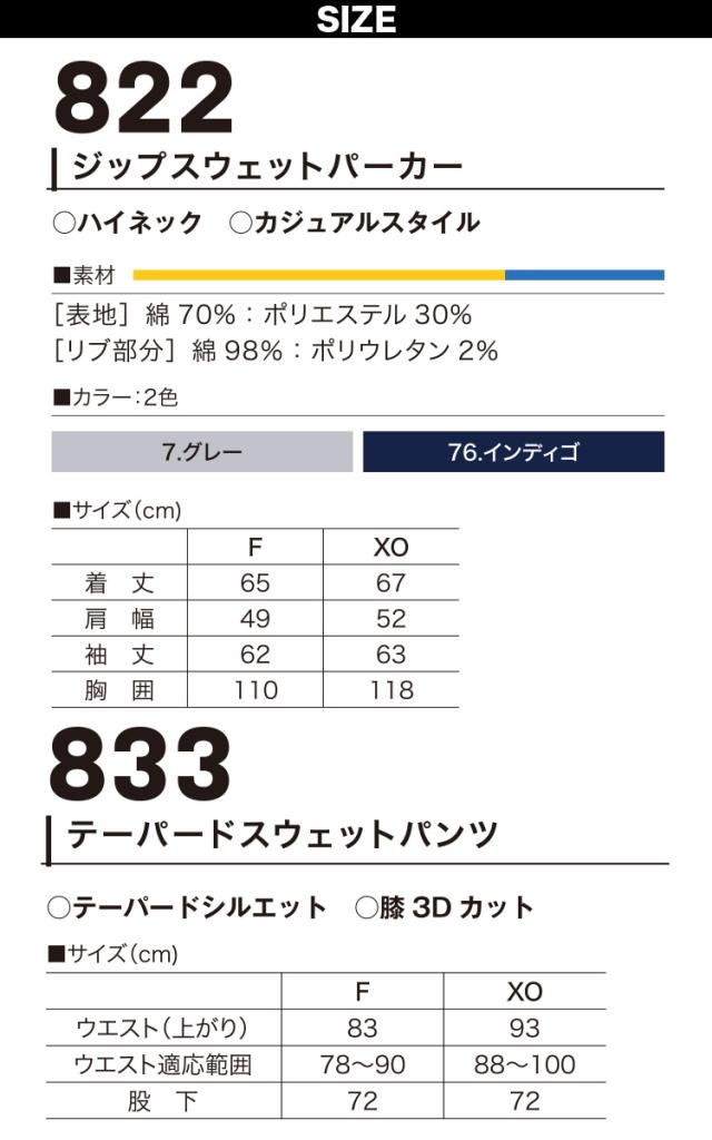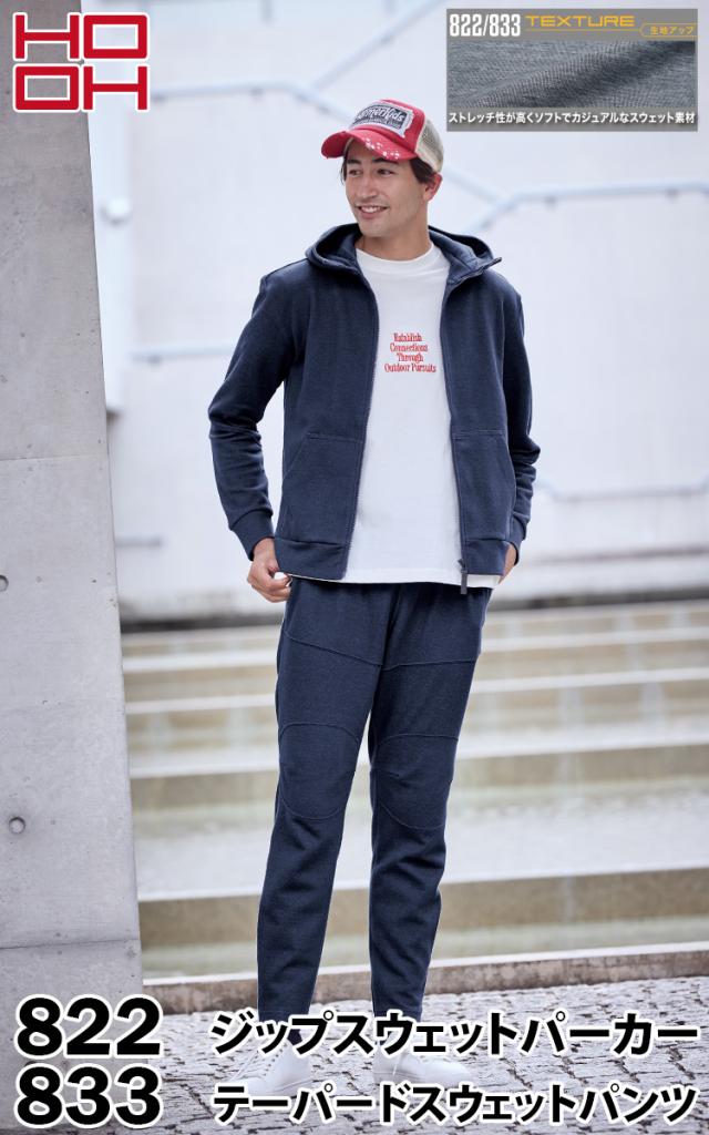 村上被服 HOOH 鳳凰 822/833 秋冬 ジップスウェットパーカー/テーパードスウェットパンツ 上下セット ジャージ カジュアル ハイネック ユニセックス 男女兼用 メンズ 大工 工場 外作業 ワークユニフォーム 土木 工事 現場 F~XO 作業服 作業着