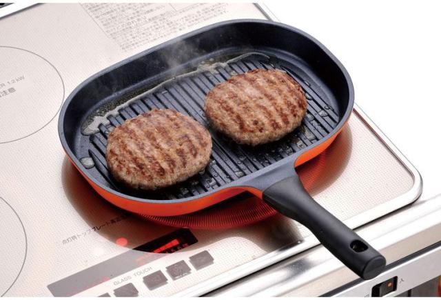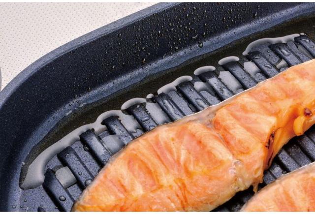 ■底面の溝に余分な脂が落ちるので、食材が脂に浸らず調理できます。