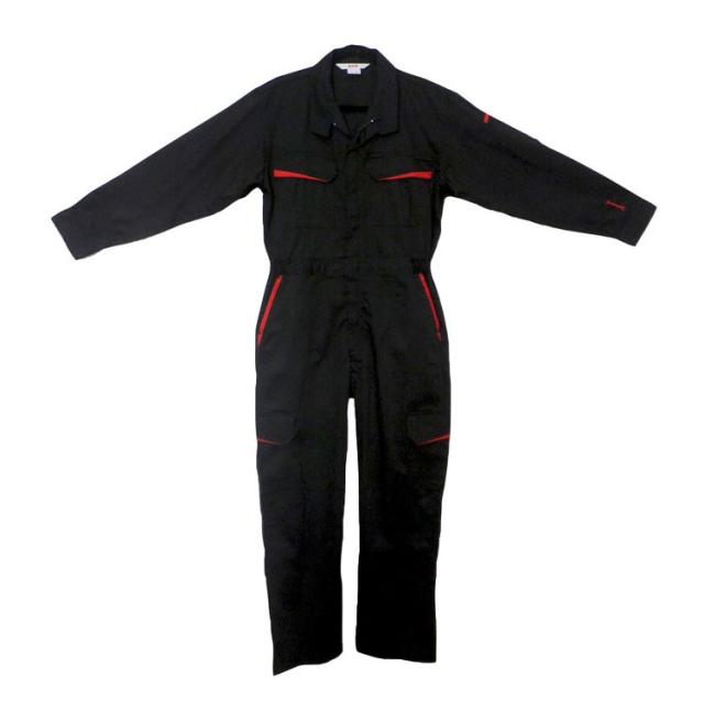 ●カラーはおしゃれなネイビーとスタイリッシュなブラックの2色展開で、赤の差し色がとても映えるつなぎ服です。