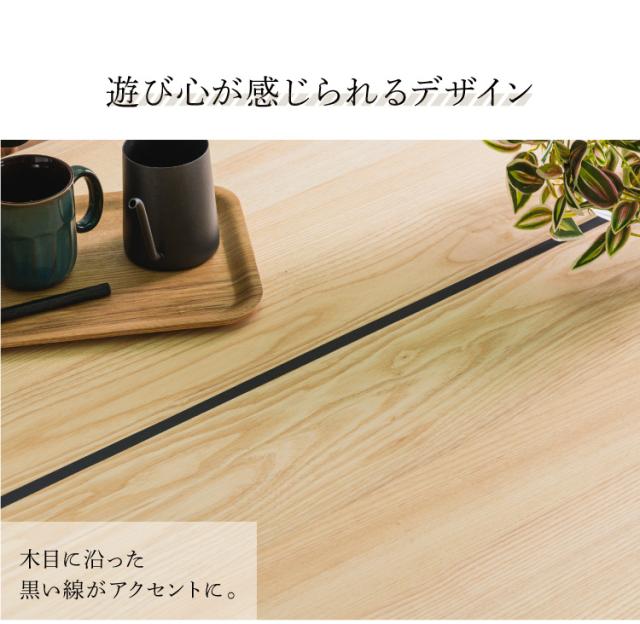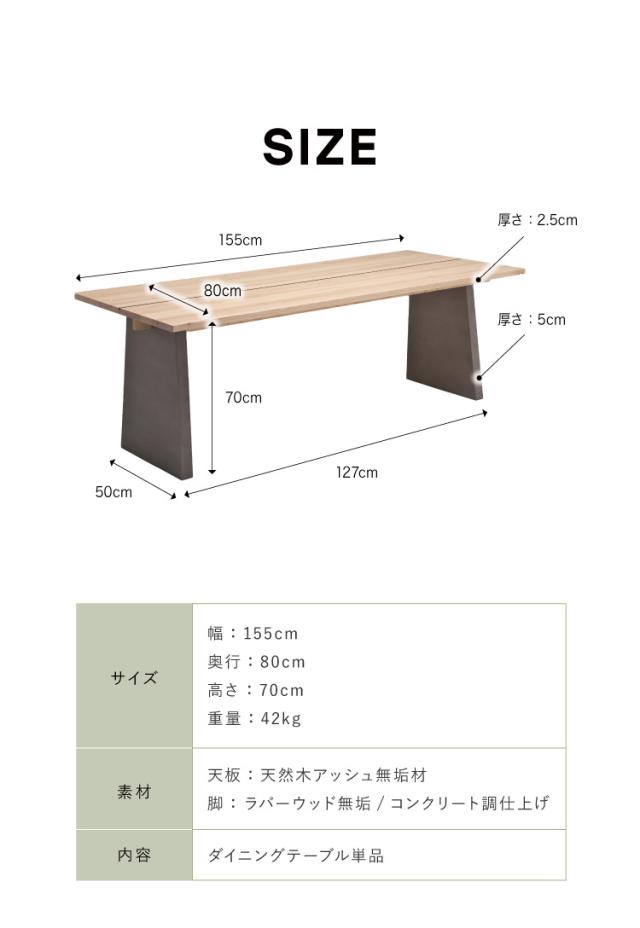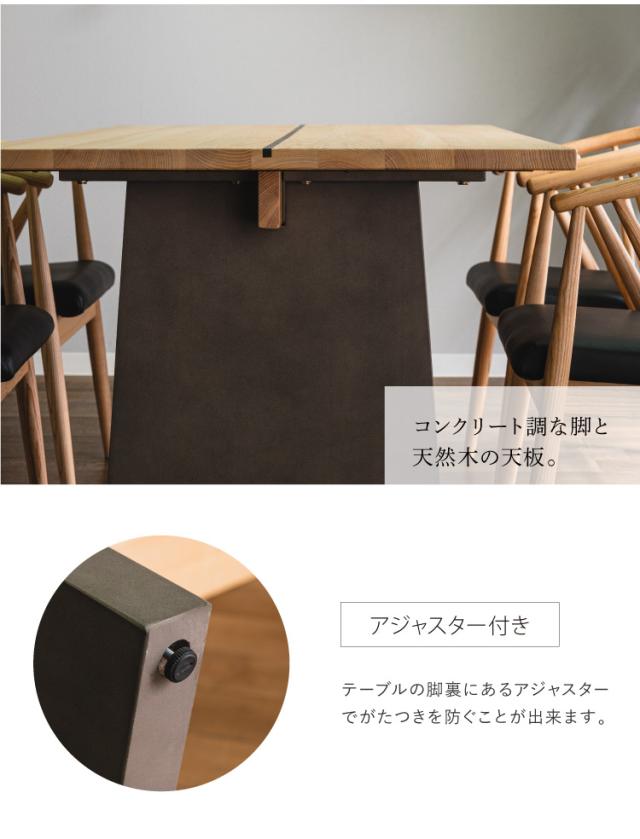 木の風合いを十分に活かしアッシュ無垢材との異素材を現代風モダンに仕上げたコンクリ調脚とのバランスが特徴