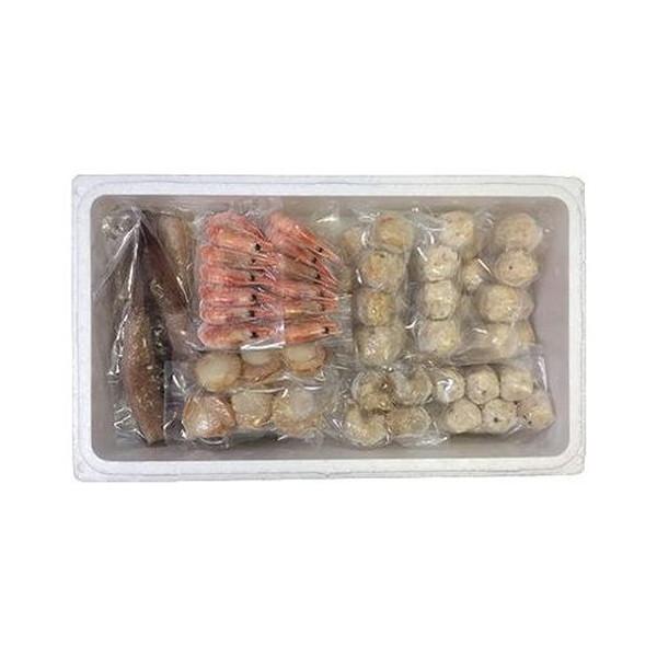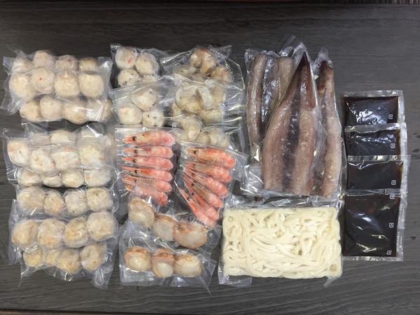 かに入つみれ×12個、えび入つみれ×12個、とりごぼうつみれ×12個、たこ入つみれ×12個、ボイル海老×12尾、ボイル帆立×6個、ボイルつぶ60g×3袋、ツボ抜きいか100g×3尾、冷凍うどん250g×1玉、たれ(濃縮:醤油仕立て)50ml×4袋