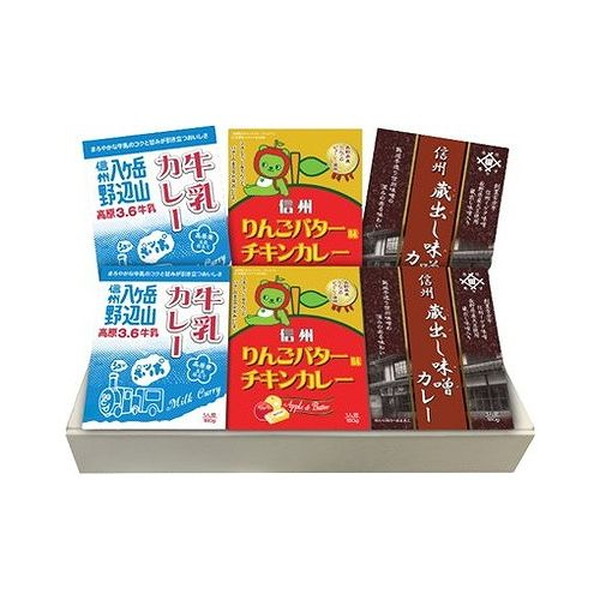 信州の美味しさを詰め込んだカレーギフトです。牛乳カレー、りんごバター味チキンカレー、蔵出しみそカレーの3種類の味をお楽しみいただけます。