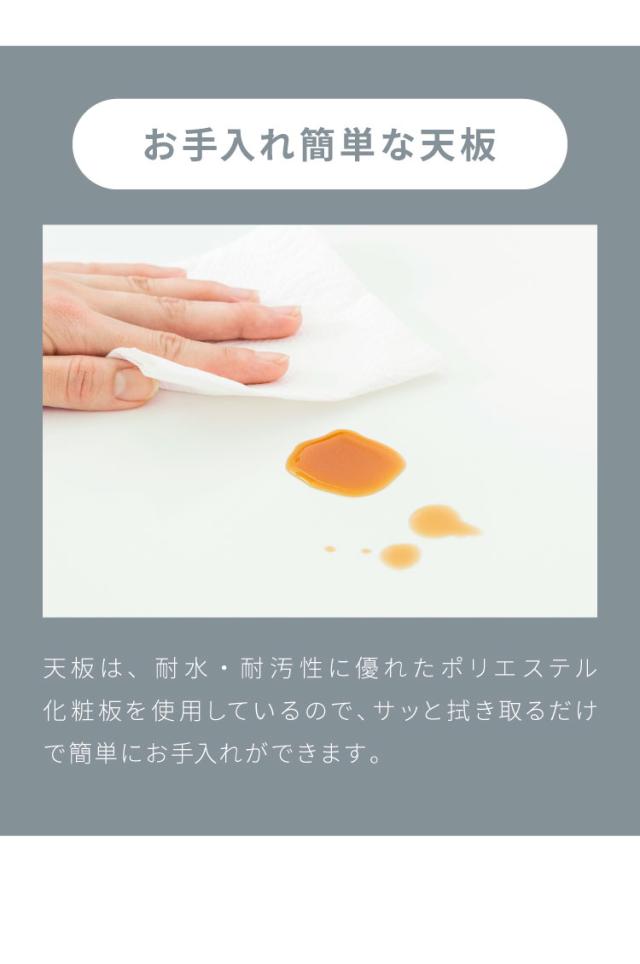 天板は耐水・耐汚性に優れたポリエステル化粧板を強いようしているのでお手入れが簡単です!