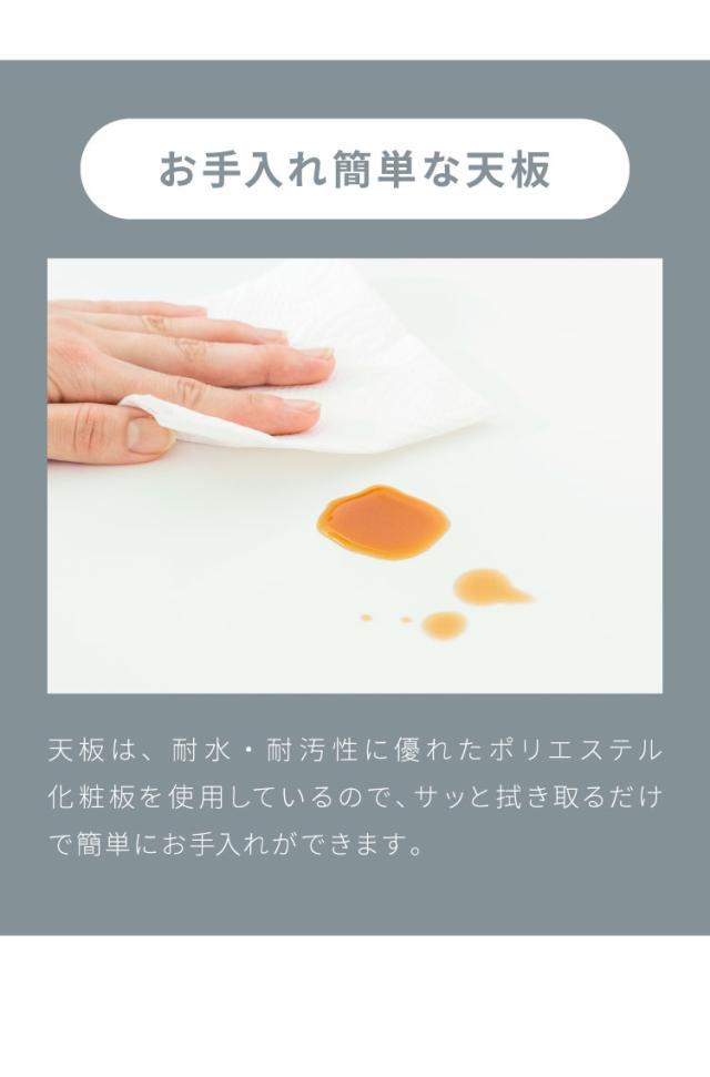 天板は耐水・耐汚性に優れたポリエステル化粧板を強いようしているのでお手入れが簡単です!