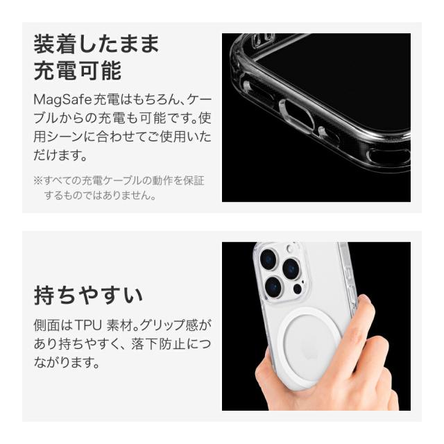 【耐衝撃】 高速充電対応・MagSafeアクセサリが使える強力ステンレスリング搭載/高透明なポリカーボネートと、柔らかく耐衝撃性に優れたTPUのハイブリッドケース/角に衝撃を吸収するエアクッションを搭載/柔軟性があり着脱が簡単/ボタンやカメラレンズ周りを保護。