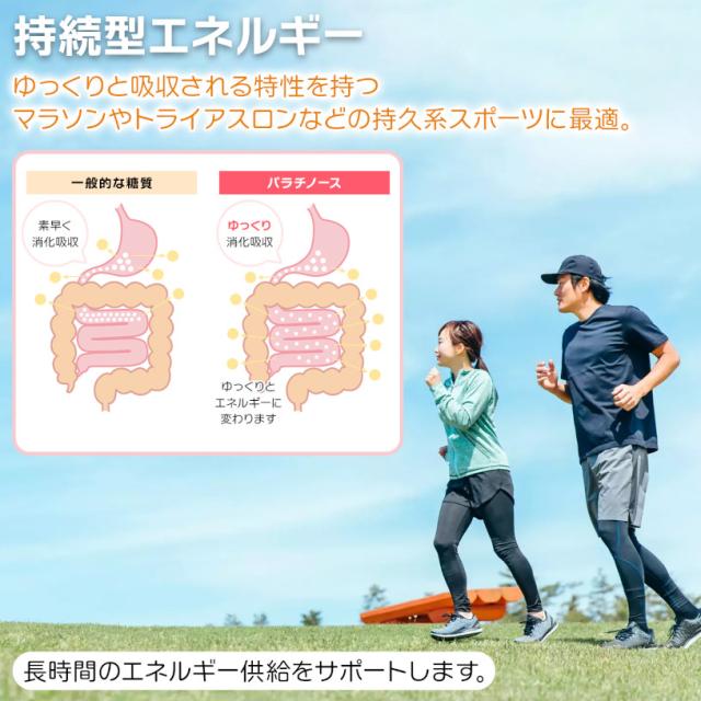 パラチノースは、てん菜由来の天然糖質です。持久系スポーツに最適で、ゆっくり吸収され、長時間のエネルギー供給をサポート。