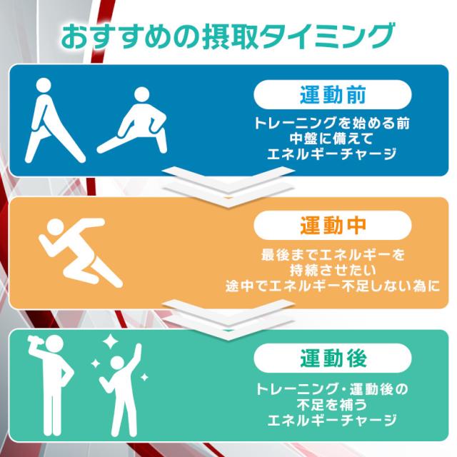| お召し上がり方 | 水やお好みのドリンクに溶かしてお召し上がり下さい。 おすすめのお召し上がりタイミング: トレーニング前からトレーニング中にかけて |