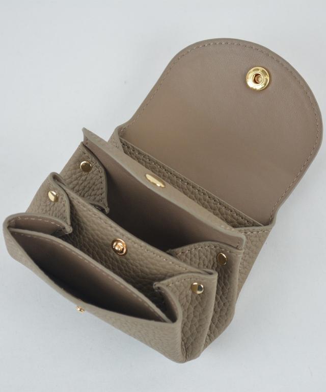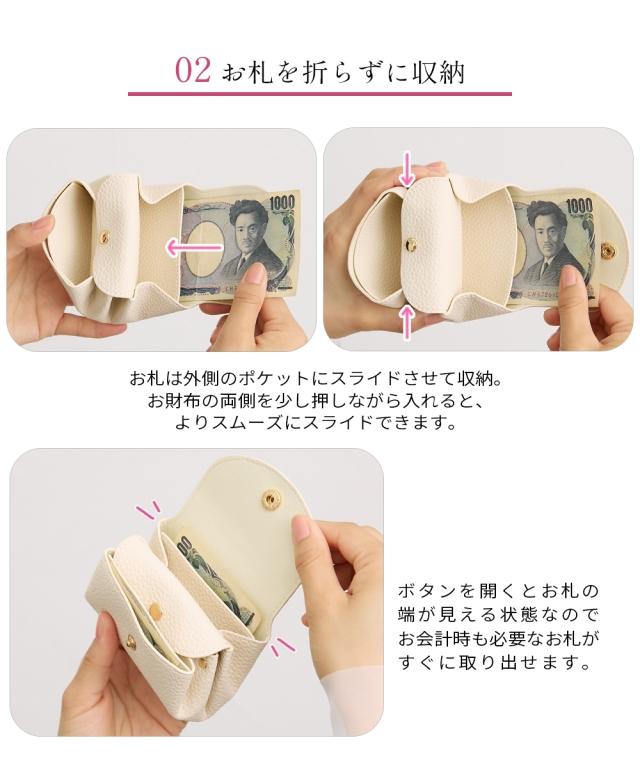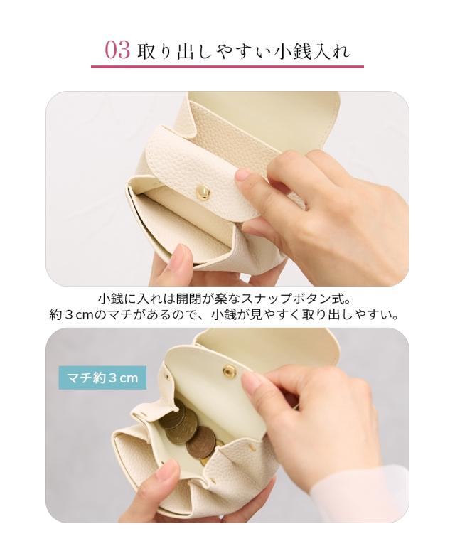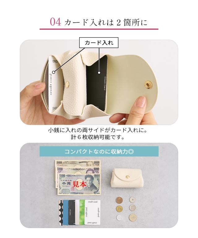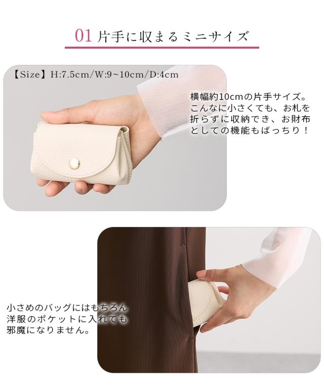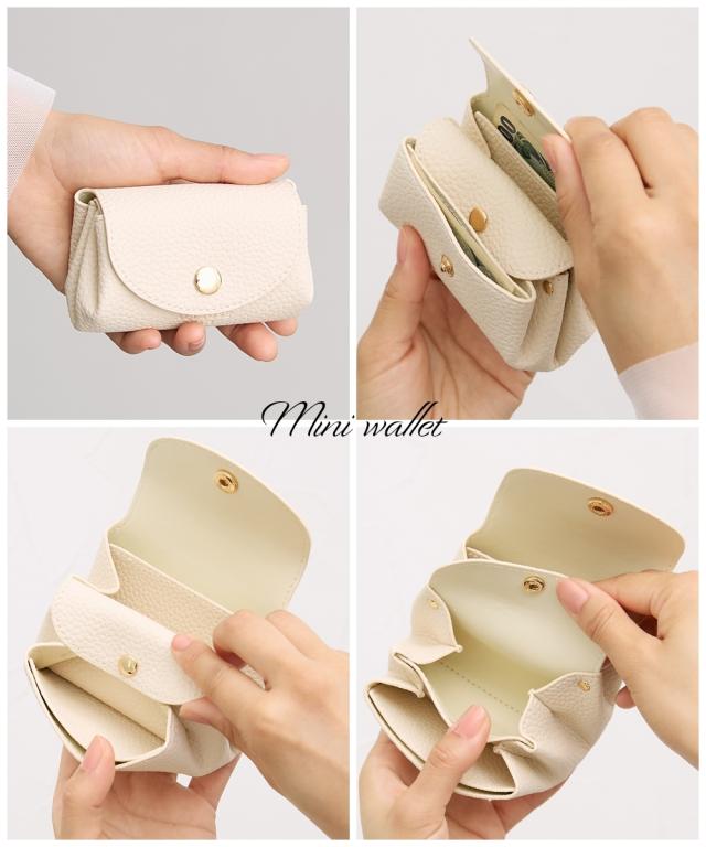 とても小さいサイズのミニサイズ財布です。 バッグの中で邪魔にならない薄さと軽さ。 小銭入れも、お札入れもあるけど手のひらサイズ。 結婚式などのお呼ばれの時に、小さい鞄でお出かけの時に、旅行など荷物を極力小さくしたいときに…色々なシーンで活躍できるおすすめアイテムです。 ■デザイン 年齢を問わず使えるシンプルなデザインです。 コロンとしたシルエットなので、小さい鞄の荷物の間にさっとしまえます。 ■素材 シボ感のある合成皮革を使用しております。