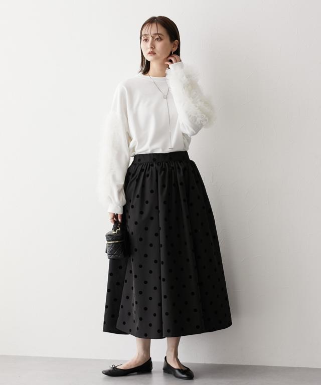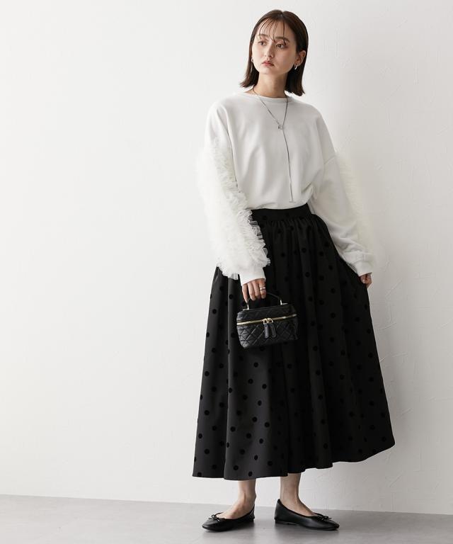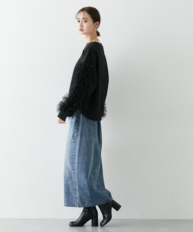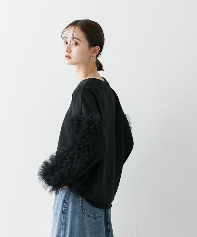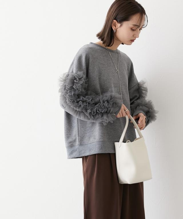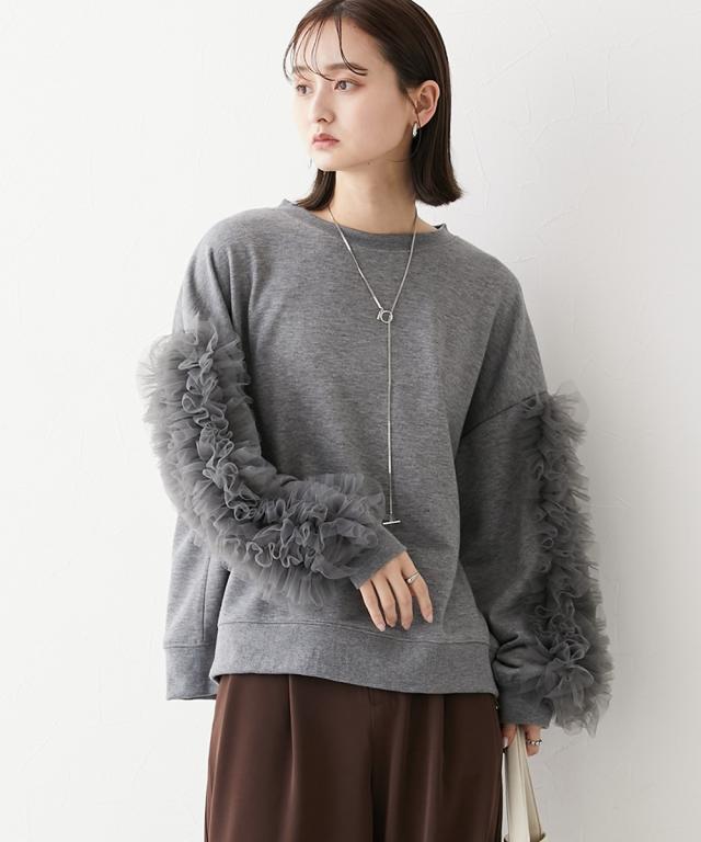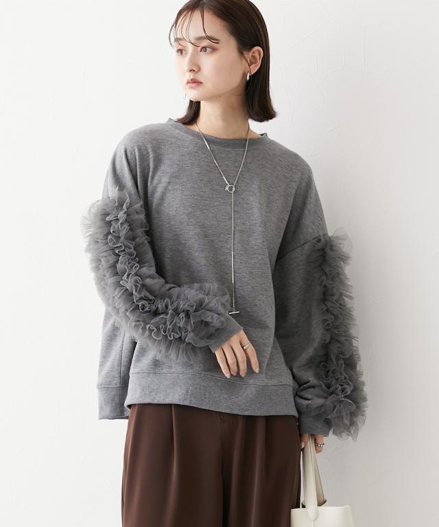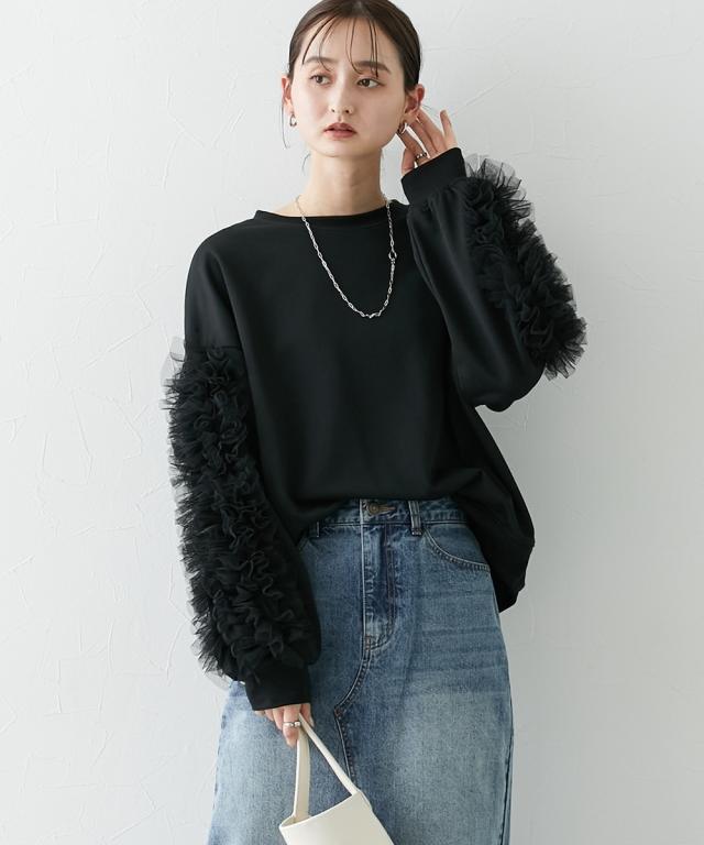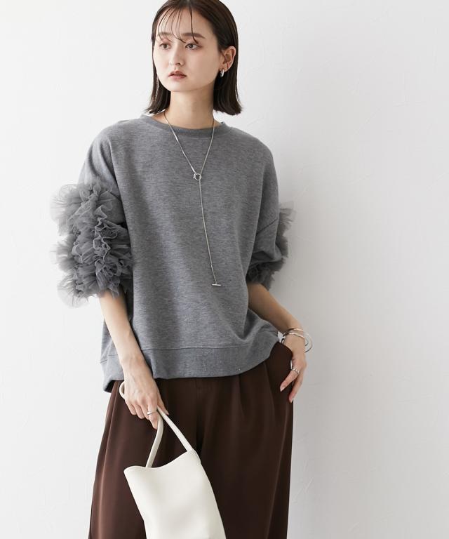 ワイドな身幅 袖フリルショート丈トレーナー ■デザイン ・袖にはチュール素材でフリルのデザイン付でシンプルなトレーナーが一気に着映えトップスに。 ・袖にボリューム感があるので、着丈はショートにし、バランス良く着こなせるように。 ・身幅もゆったりめの設計なので、ルーズに着こなせるトレーナー ■素材 フロッキープリントされたハリ感のある布帛素材です ■おすすめのスタイリング ボトムはスカートでもパンツでも合わせやすいトップスです ショート丈なので、どんなボトムでもバランスよく着こなしていただけます。 袖のチュールのボリューム感で華奢見せ効果も 【Be praised】ーーー明日ちょっと褒められる服ーーー 大人トレンドを意識したこだわりのアイテムと着こなしでアナタの毎日に輝きを。 ただシンプルできれいなだけじゃ物足りない。 カジュアルすぎず、スタイリッシュで大人の品性を感じる着こなしに。 そんな、こなれたオシャレを楽しむ女性に寄り添う、 新鮮なリアルクローズをご提案します。