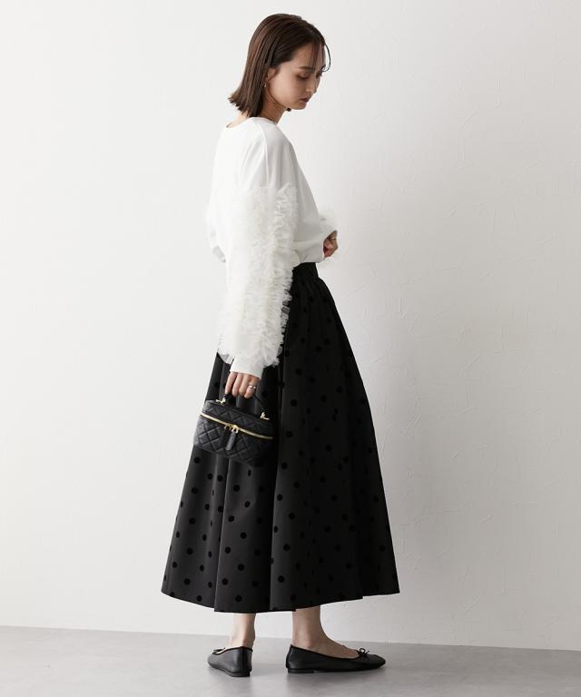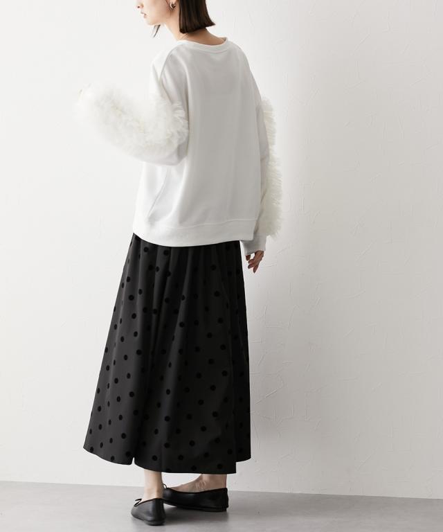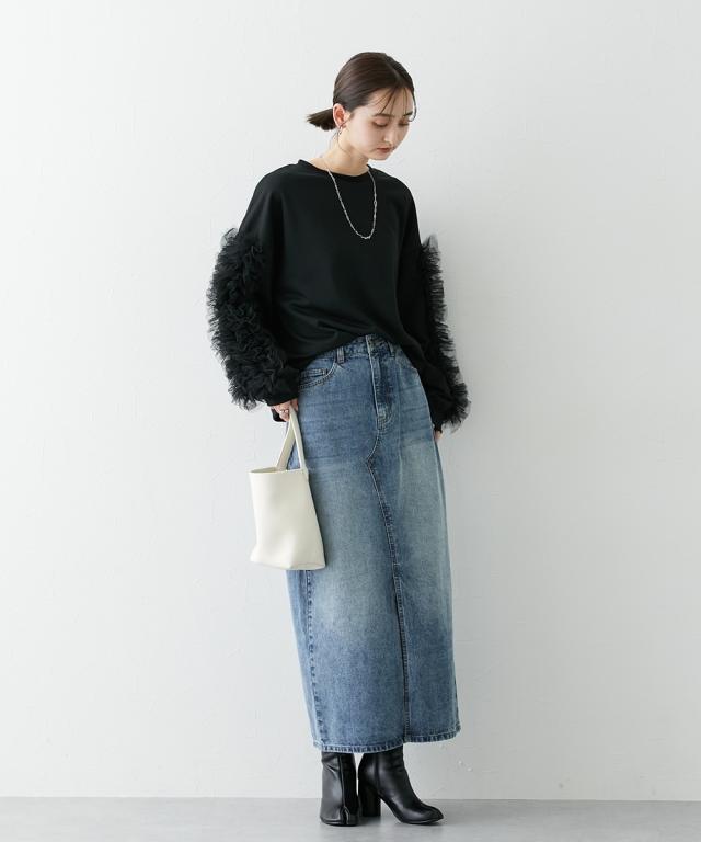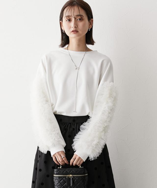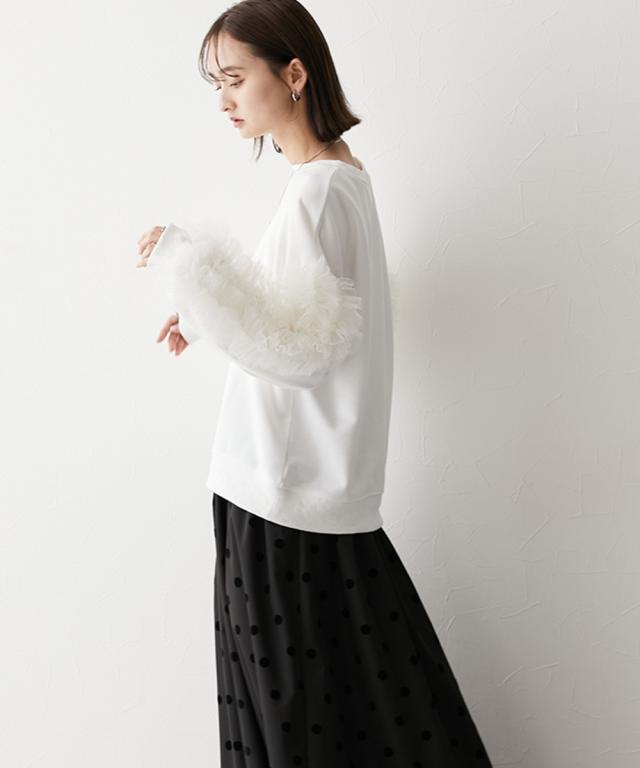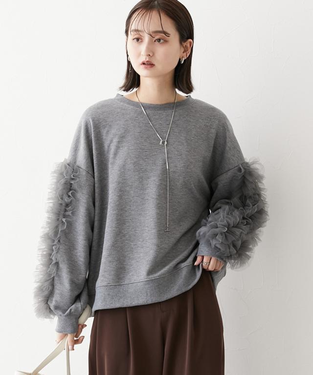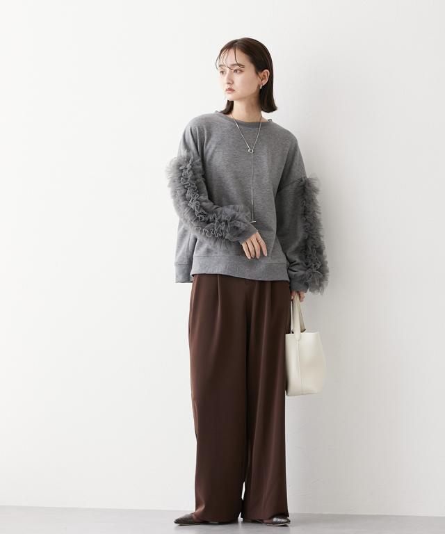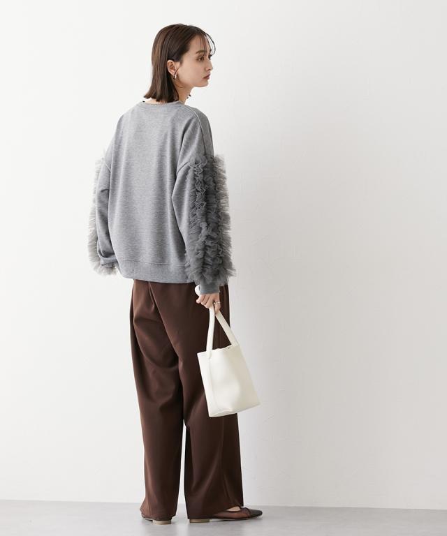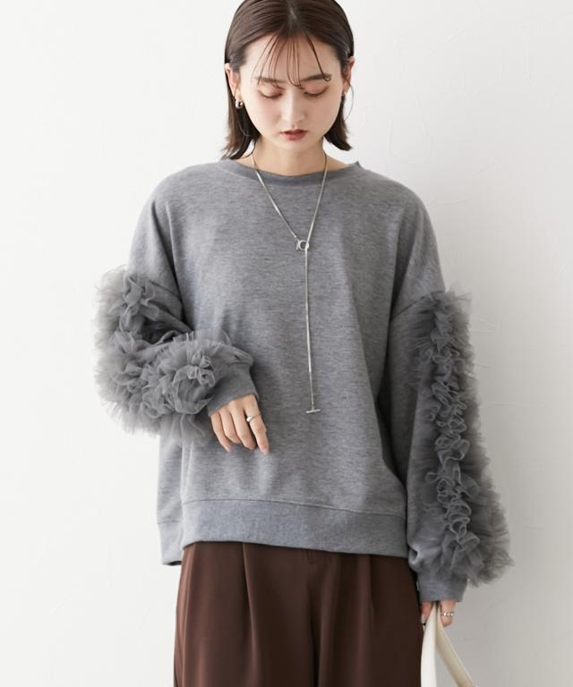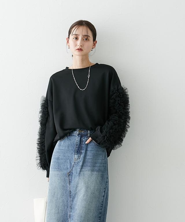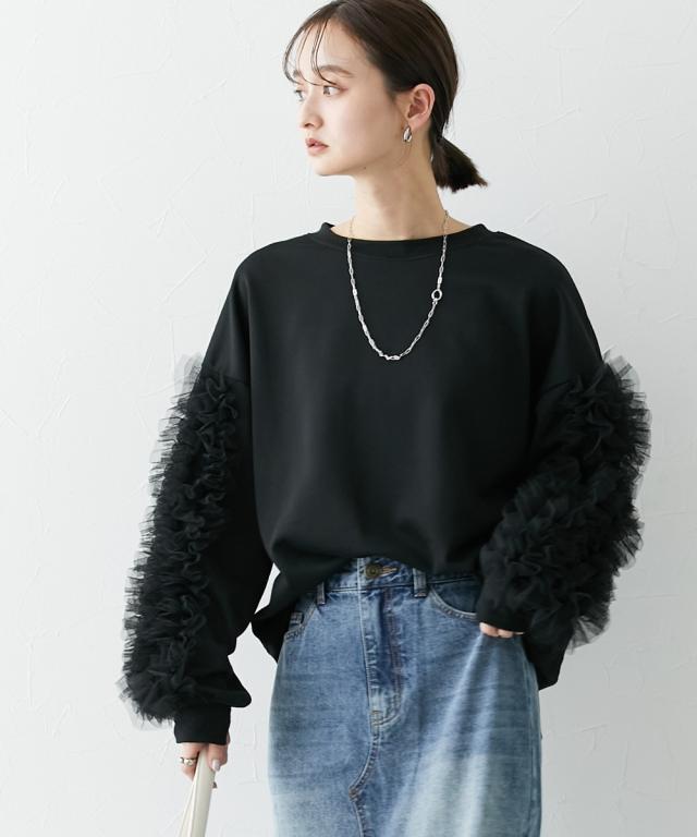 ワイドな身幅 袖フリルショート丈トレーナー ■デザイン ・袖にはチュール素材でフリルのデザイン付でシンプルなトレーナーが一気に着映えトップスに。 ・袖にボリューム感があるので、着丈はショートにし、バランス良く着こなせるように。 ・身幅もゆったりめの設計なので、ルーズに着こなせるトレーナー ■素材 フロッキープリントされたハリ感のある布帛素材です ■おすすめのスタイリング ボトムはスカートでもパンツでも合わせやすいトップスです ショート丈なので、どんなボトムでもバランスよく着こなしていただけます。 袖のチュールのボリューム感で華奢見せ効果も 【Be praised】ーーー明日ちょっと褒められる服ーーー 大人トレンドを意識したこだわりのアイテムと着こなしでアナタの毎日に輝きを。 ただシンプルできれいなだけじゃ物足りない。 カジュアルすぎず、スタイリッシュで大人の品性を感じる着こなしに。 そんな、こなれたオシャレを楽しむ女性に寄り添う、 新鮮なリアルクローズをご提案します。