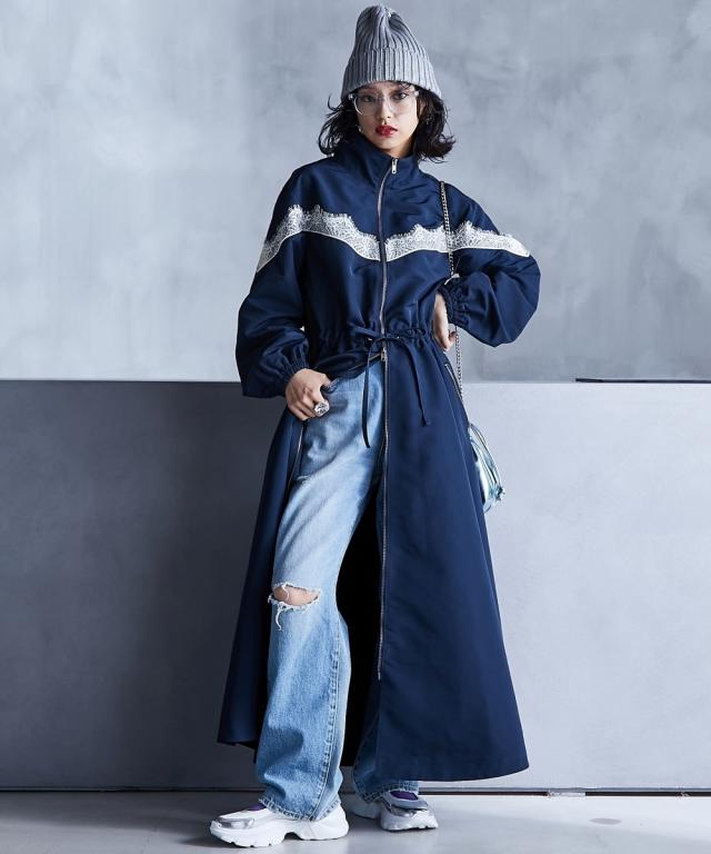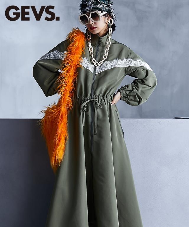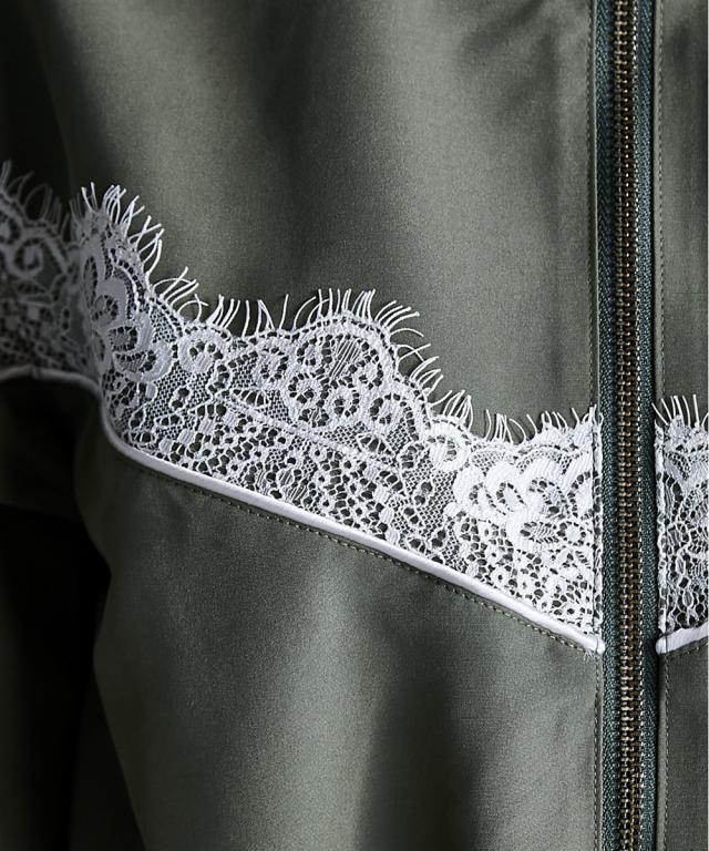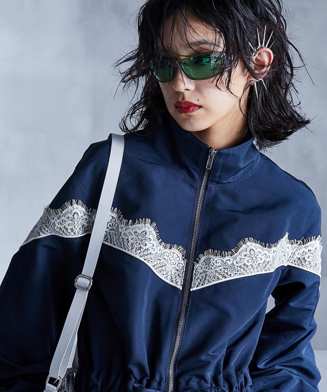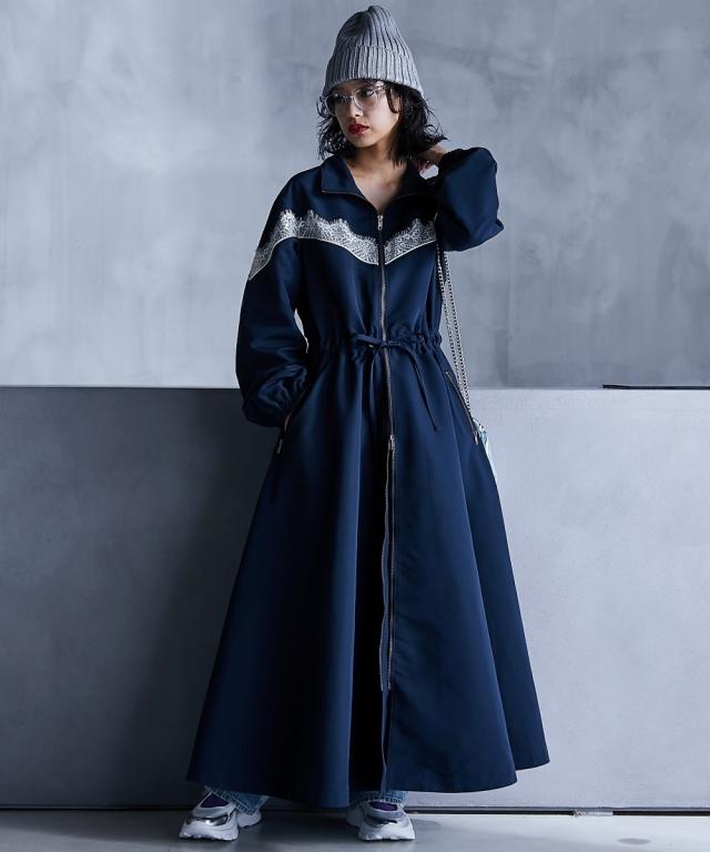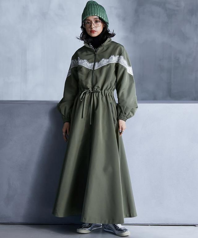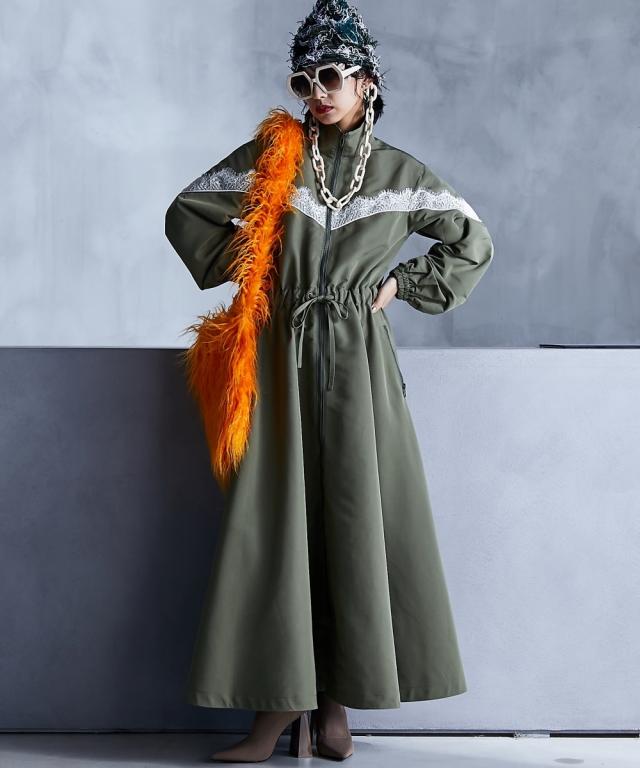 スポーティーでフェミニンなワンピース。 ■デザイン 流行りのスポーティーテイストに、あえてガーリーなレースをあしらうことで、ミックス感を演出。 ワンピースとしてだけでなく、ジップを閉じて羽織りとしても 。 フロントジップの開閉やウエストをドローコードで絞ることでシルエットも自在に変えられます。 ■素材 張り感のあるスポーツテイストポリエステルグログラン生地を使用。 ■おすすめのスタイリング 1枚でワンピースとしてはもちろん、インナーにタートルニットを合わせたり、パンツを合わせたレイヤードスタイルもオススメです。