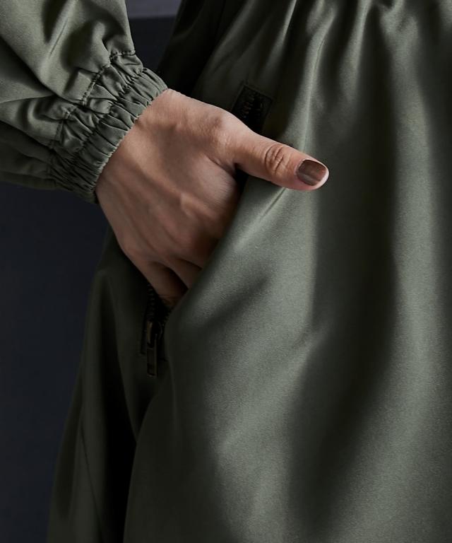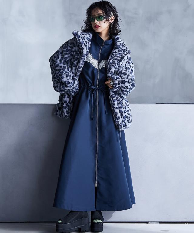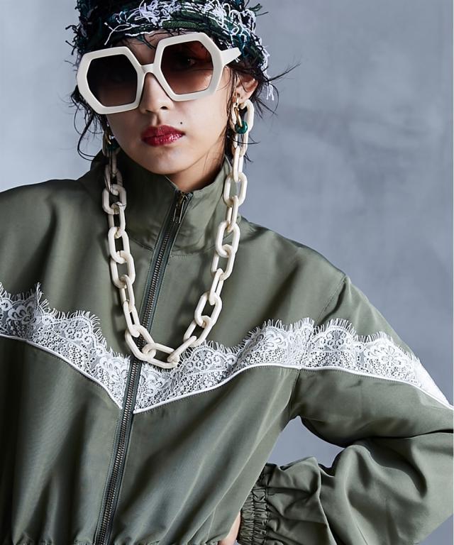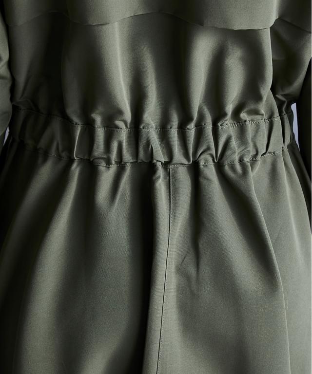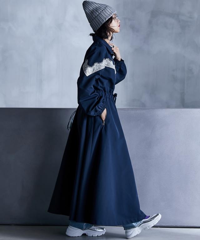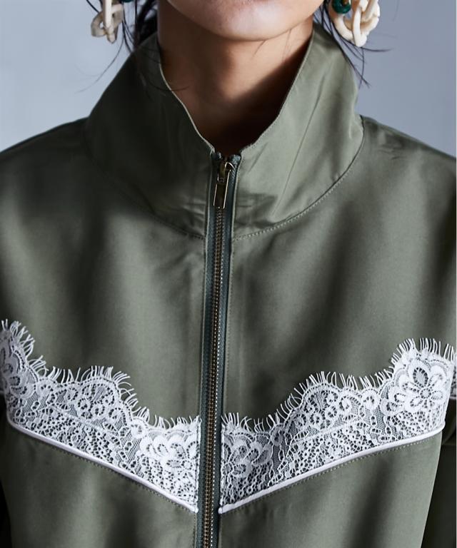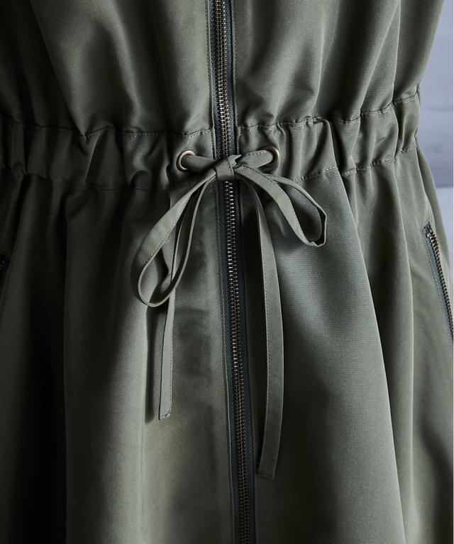 スポーティーでフェミニンなワンピース。 ■デザイン 流行りのスポーティーテイストに、あえてガーリーなレースをあしらうことで、ミックス感を演出。 ワンピースとしてだけでなく、ジップを閉じて羽織りとしても 。 フロントジップの開閉やウエストをドローコードで絞ることでシルエットも自在に変えられます。 ■素材 張り感のあるスポーツテイストポリエステルグログラン生地を使用。 ■おすすめのスタイリング 1枚でワンピースとしてはもちろん、インナーにタートルニットを合わせたり、パンツを合わせたレイヤードスタイルもオススメです。