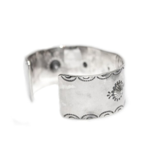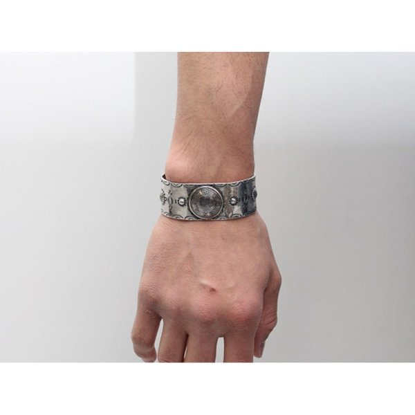 実際に使われていた日本のフラワーモチーフの銀貨(銀720 銅280)をコンチョ状に加工し、中央にセットした幅広のワイドバングルです。ネイティブアメリカンと同じスタンプワーク技法を、僕達の身の周りに存在するシンボルの刻印を使用した民族柄で作られるTokyo-Tominzokuラインとなります。宝永火山まで再現した富士山の刻印や、恵みを意味する雨や雫の刻印、裏面から押し上げ立体を作るリポーズという技法でフラワーまで再現した、まさに日本国民族、純粋メイドインジャパンのバングルです。